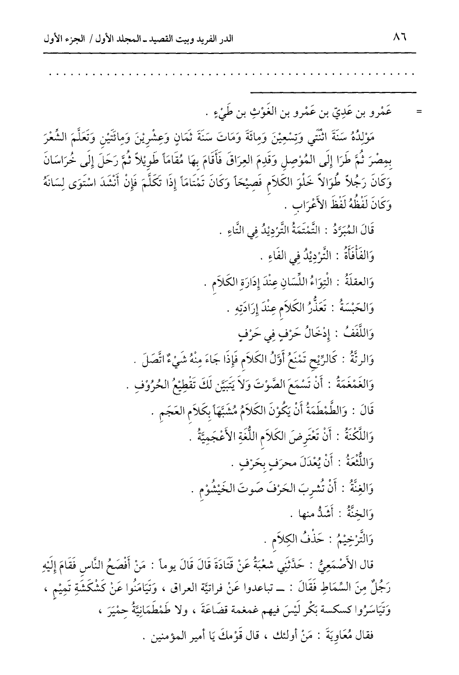 قال الأَصْمَعِيُّ: حَدَّثنَي شعْبَةُ عَنْ قَتَادَةَ قَالَ قَالَ يومًا: مَنْ أَفْصَحُ النَّاسِ فَقَامَ إِلَيْهِ رَجُلٌ مِنَ السِّمَاطِ فَقَالَ: - تباعدوا عَنْ فراتيَّة العراق، وَتَيَامَنُوا عَنْ كَشْكَشَةِ تَمِيْمٍ، وَتَيَاسَرُوا كسكسة بَكْر لَيْسَ فيهم غمغمة قضاعَةَ، ولا طَمْطَمَانِيَّةُ حِمْيَرَ.