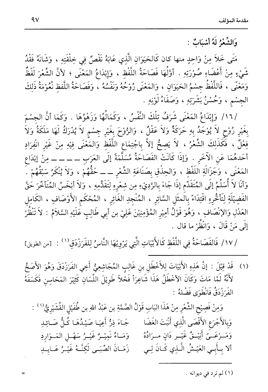 وَإِبْدَاعُ المَعْنَى شَرَفُ تِلْكَ النَّفْسُ، وَكَمَالُهُا وَزَهْوُهَا. وَكَمَا أنَّ الجِسْمَ بِغَيْرِ رُوْحٍ لَا يُوْجَدُ بِهِ حَرَكَة وَلَا عَقْلٌ، وَالرُّوْحَ بِغَيْرِ جِسْمٍ لَا يُدْرَكُ لَهَا مَلَكَةُ وَلَا فِعْلٌ، فَكذَلِكَ الشِّعْرُ، لَا يَصحُّ إلَّا بِاجْتِمَاع اللَّفْظِ وَالمَعْنَى فِيْهِ مِنْ غَيْرِ انْفِرَادِ أحَدهُمَا عَنِ الآخَرِ. وَإذَا كَانَتْ الفَصاحَةُ مُسَلَّمَةً إلَى العَرَبِ ---- مِنْ إبْدَاعِ المَعْنَى، وَجَزَالَةِ اللَفْظِ، وَالحِذْقِ بِصنَاعَةِ الشِّعْرِ -- حَقُّهُمْ، وَلَا يُنْكَرُ سَبْقُهُمْ. وَأنَا لَا أُسَلِّمُ إلَى المُتَقَدِّمِ إِذَا جَاءَ بِالرَّدِيْءِ مِن شِعْرِهِ لِتَقَدُّمِهِ، وَلَا أبْخَسُ المُتَأخِّرَ حَقَّ الفَضِيْلَةِ لِتَأخُّرِهِ اقْتِدَاءً بِالمئَلِ السَّائِرِ، المُنْجِدِ الغَائِرِ، المُحْكَمِ الأَوْصَافِ، الكَامِلِ العَدْلِ وَالإنْصَافِ، وَهُوَ قَوْلُ أمِيْرِ المُؤْمِنِيْنَ عَلِيّ بن أبِي طَالِبٍ عَلَيْهِ السَّلَامُ: لَا تَنْظُرْ إلَى مَنْ قَالَ، وَانْظُرْ ما قال.