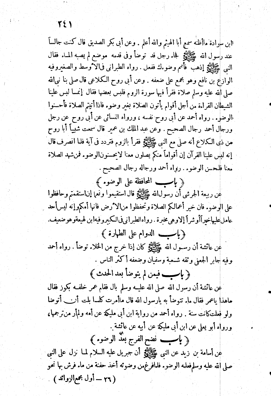 1245 - عَنْ أُسَامَةَ بْنِ زَيْدٍ، «عَنِ النَّبِيِّ - صَلَّى اللَّهُ عَلَيْهِ وَسَلَّمَ - أَنَّ جِبْرِيلَ - عَلَيْهِ السَّلَامُ - لَمَّا نَزَلَ عَلَى النَّبِيِّ - صَلَّى اللَّهُ عَلَيْهِ وَسَلَّمَ - فَعَلَّمَهُ الْوُضُوءَ، فَلَمَّا فَرَغَ مِنْ وُضُوئِهِ أَخَذَ حَفْنَةً مِنْ مَاءٍ، فَرَشَّ بِهَا نَحْوَ