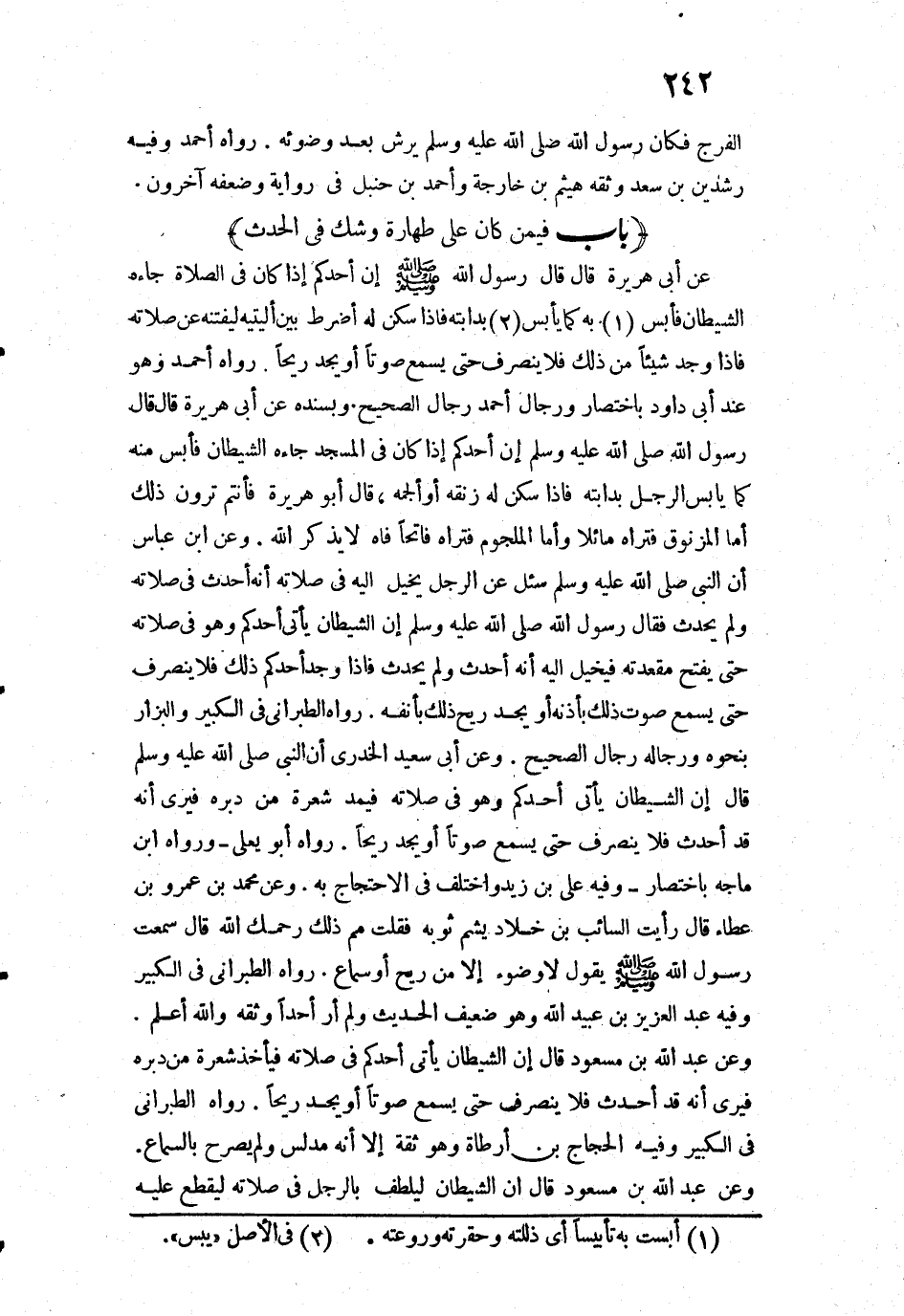 1246 - عَنْ أَبِي هُرَيْرَةَ قَالَ: «قَالَ رَسُولُ اللَّهِ - صَلَّى اللَّهُ عَلَيْهِ وَسَلَّمَ -: " إِنَّ أَحَدَكُمْ إِذَا كَانَ فِي الصَّلَاةِ جَاءَهُ الشَّيْطَانُ فَأَبَسَ بِهِ كَمَا يَأْبِسُ بِدَابَّتِهِ، فَإِذَا سَكَنَ لَهُ أَضْرَطَ بَيْنَ أَلْيَتَيْهِ لِيَفْتِنَهُ عَنْ صَلَاتِهِ، فَإِذَا وَجَدَ شَيْئًا مِنْ ذَلِكَ فَلَا يَنْصَرِفُ حَتَّى يَسْمَعَ صَوْتًا أَوْ يَجِدَ رِيحًا» ".