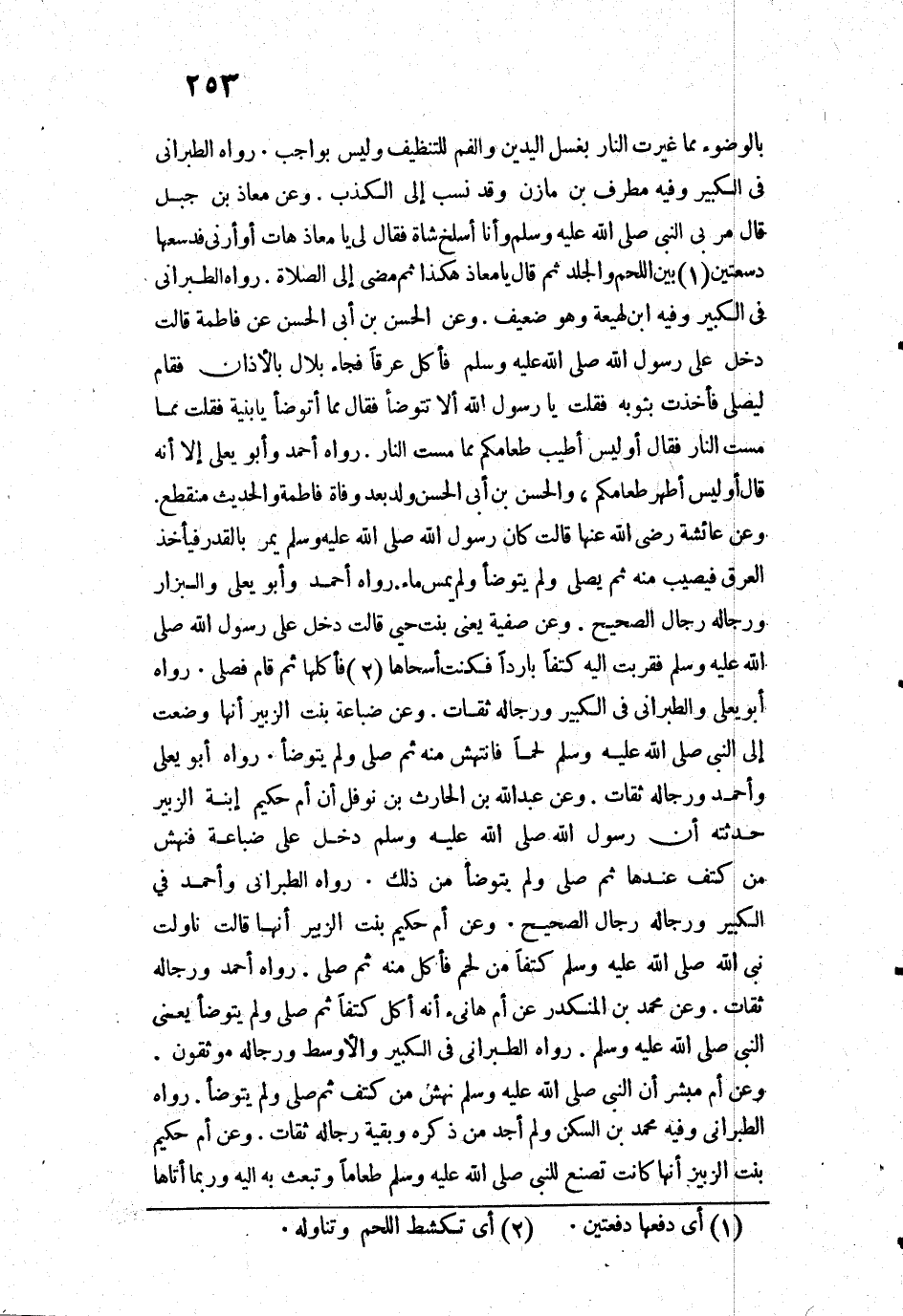 1334 - «وَعَنْ ضُبَاعَةَ بِنْتِ الزُّبَيْرِ أَنَّهَا وَضَعَتْ إِلَى النَّبِيِّ - صَلَّى اللَّهُ عَلَيْهِ وَسَلَّمَ - لَحْمًا، فَانْتَهَشَ مِنْهُ ثُمَّ صَلَّى وَلَمْ يَتَوَضَّأْ».