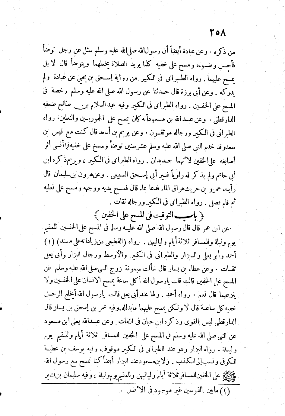1384 - عَنِ ابْنِ عُمَرَ قَالَ: «قَالَ رَسُولُ اللَّهِ - صَلَّى اللَّهُ عَلَيْهِ وَسَلَّمَ -: " فِي الْمَسْحِ عَلَى الْخُفَّيْنِ لِلْمُقِيمِ يَوْمٌ وَلَيْلَةٌ، وَلِلْمُسَافِرِ ثَلَاثَةُ أَيَّامٍ وَلَيَالِيهِنَّ» ".