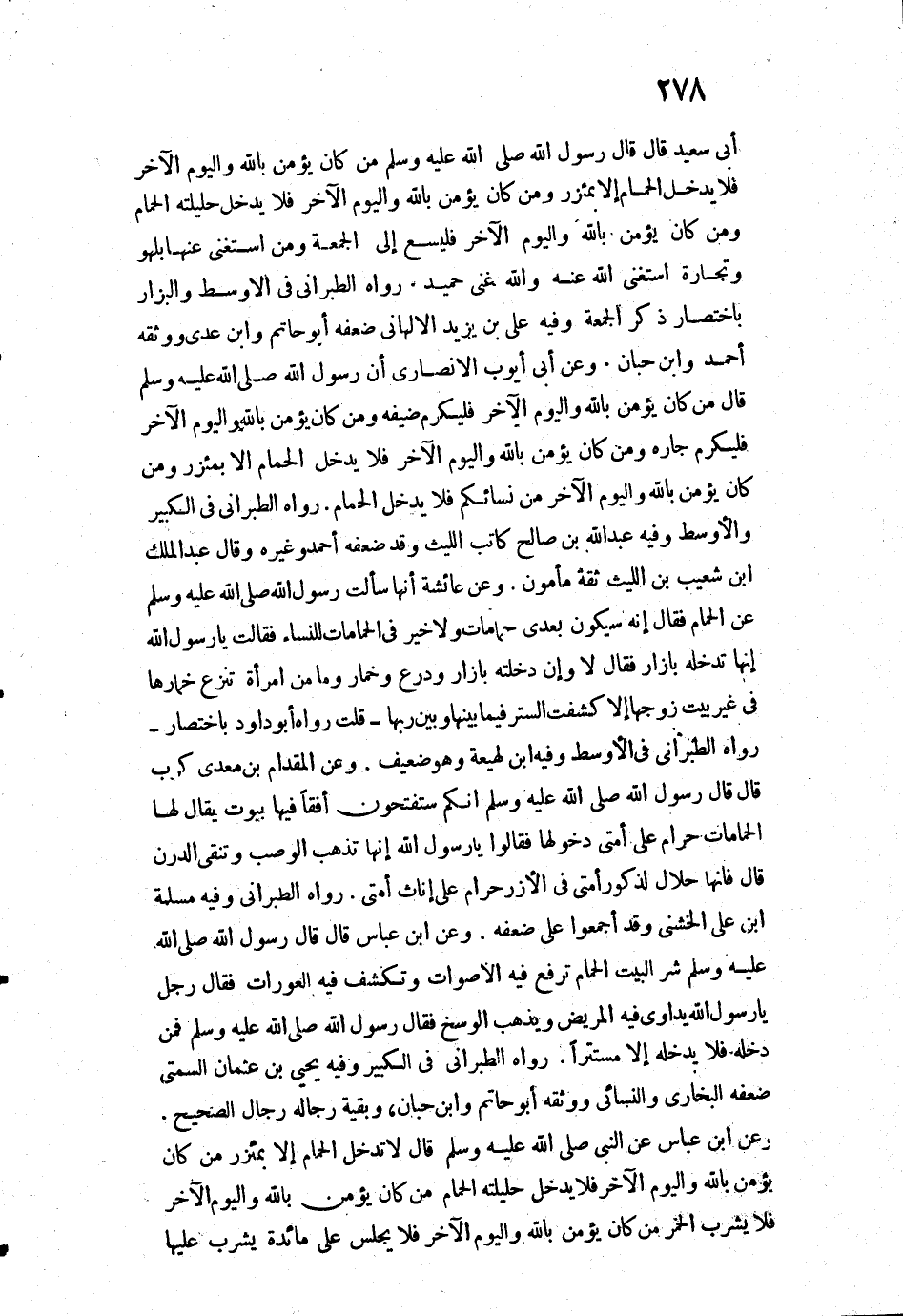 أَبِي سَعِيدٍ قَالَ: قَالَ رَسُولُ اللَّهِ - صَلَّى اللَّهُ عَلَيْهِ وَسَلَّمَ: " «مَنْ كَانَ يُؤْمِنُ بِاللَّهِ وَالْيَوْمِ الْآخِرِ فَلَا يَدْخُلِ الْحَمَّامَ إِلَّا بِمِئْزَرٍ، وَمَنْ كَانَ يُؤْمِنُ بِاللَّهِ وَالْيَوْمِ الْآخِرِ فَلَا يُدْخِلْ حَلِيلَتَهُ الْحَمَّامَ، وَمَنْ كَانَ يُؤْمِنُ بِاللَّهِ وَالْيَوْمِ الْآخِرِ فَلْيَسْعَ إِلَى الْجُمْعَةِ، وَمَنِ اسْتَغْنَى عَنْهَا بِلَهْوٍ وَتِجَارَةٍ اسْتَغْنَى اللَّهُ عَنْهُ، وَاللَّهُ غَنِيٌّ حَمِيدٌ» ".