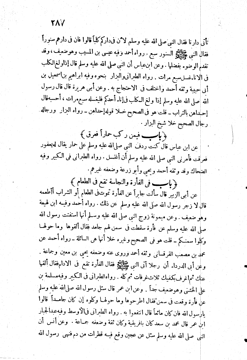 تَأْتِي دَارَنَا؟ فَقَالَ النَّبِيُّ - صَلَّى اللَّهُ عَلَيْهِ وَسَلَّمَ -: " لِأَنَّ فِي دَارِكُمْ كَلْبًا ". قَالُوا: فَإِنَّ فِي دَارِهِمْ سِنَّوْرًا، فَقَالَ النَّبِيُّ - صَلَّى اللَّهُ عَلَيْهِ وَسَلَّمَ -: " السِّنَّوْرُ سَبُعٌ».