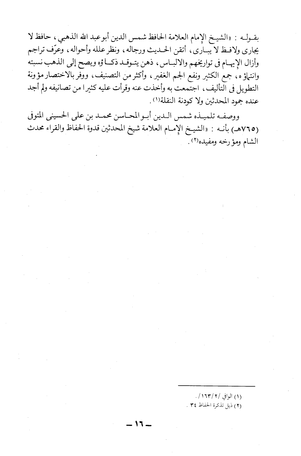بقوله: "الشيخ الإمام العلامة الحافظ شمس الدين أبو عبد الله الذهبي، حافظ لا يجارى، ولافظ لا يبارى، أتقن الحديث ورجاله، ونظر علله وأحواله، وعرّف تراجم، وأزال الإيهام في تواريخهم والإلباس، ذهن يتوقد ذكاؤه، ويصح إلى الذهب نسبته وانتماؤه، جمع الكثير ونفع الجم الغفير، وأكثر من التصنيف، ووفر بالاختصار مؤونة التطويل في التأليف، اجتمعت به وأخذت عنه وقرأت عليه كثيراً من تصانيفه، ولم أجد عنده جمود المحدثين، ولا كودنة النقلة (1) .