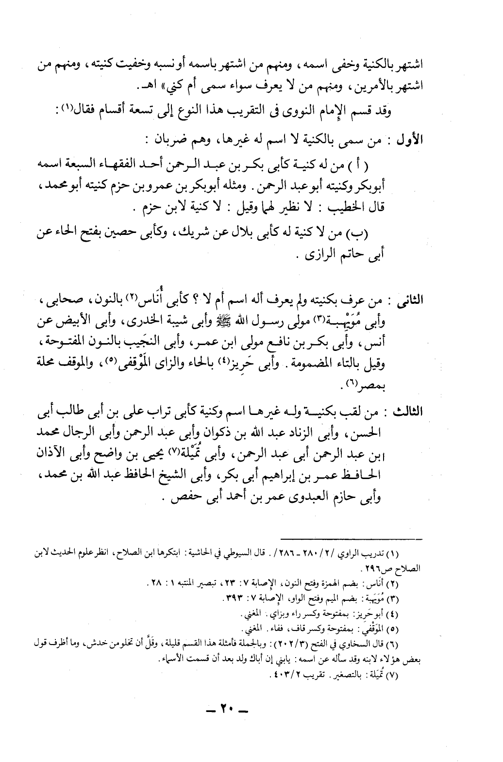 من اشتهر بالكنية وخفي اسمه، ومنهم من اشتهر باسمه أو نسبه وخفيت كنيته، ومنهم من اشتهر بالأمرين، ومنهم من لا يعرف سواء سمي أو كني" ا. هـ.