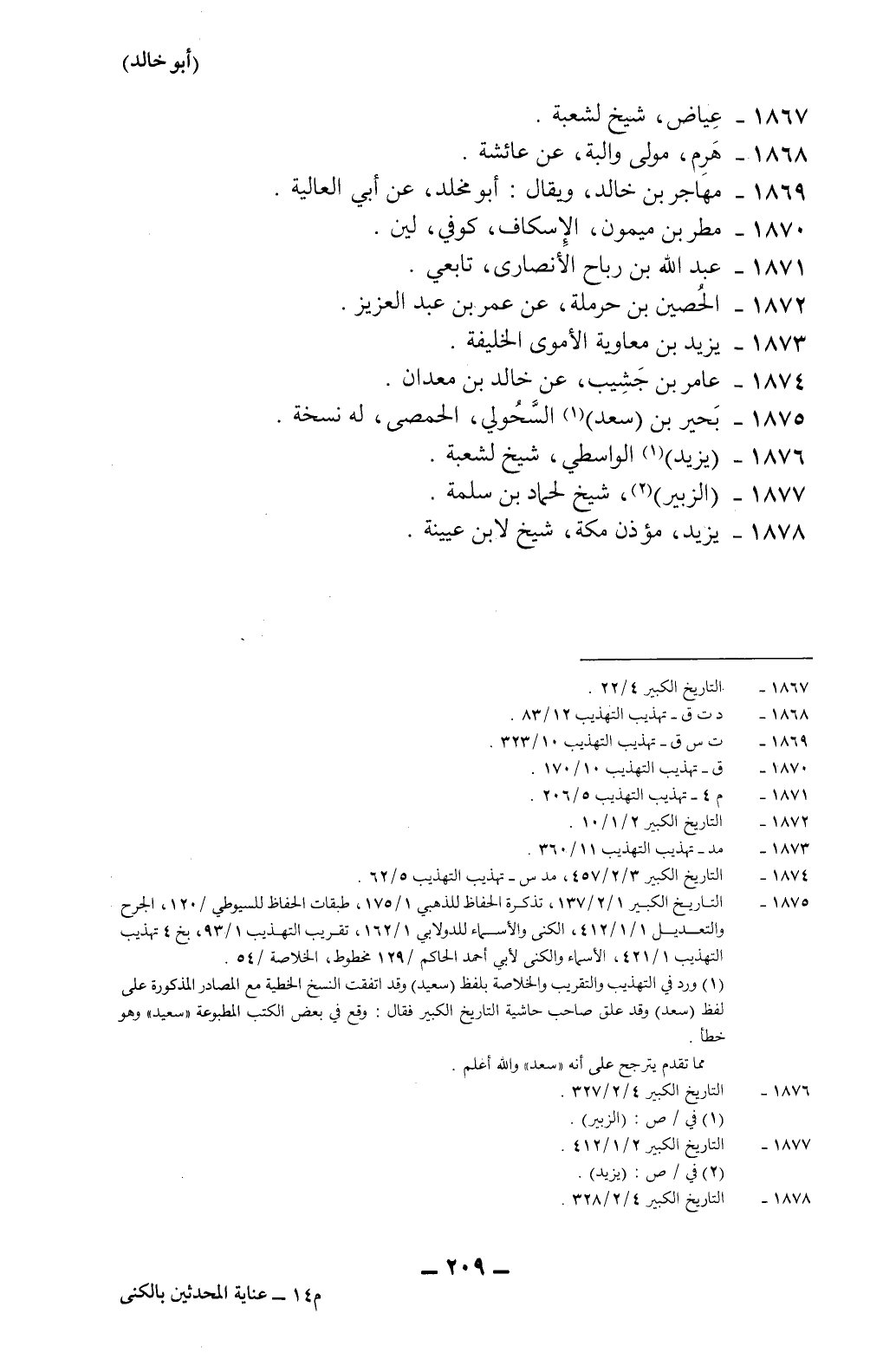 1 ورد في التهذيب والتقريب والخلاصة بلفظ: (سعيد) ، وقد اتفقت النسخ الخطية من المصادر المذكورة على لفظ: (سعد) ، وقد علق صاحب حاشية التاريخ الكبير فقال: وقع في بعض الكتب المطبوعة: (سعيد) ، وهو خطأ.