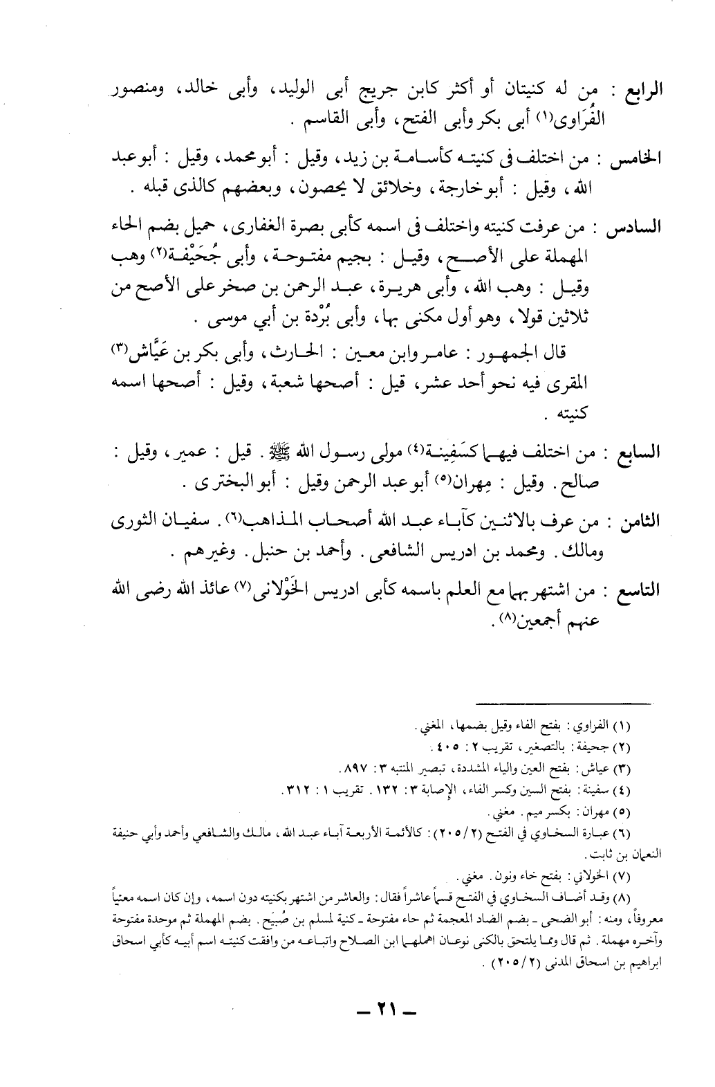 الثامن: من عرف بالاثنين كآباء عبد الله أصحاب المذاهب (6) ، سفيان الثوري ومالك، ومحمد بن إدريس الشافعي، وأحمد بن حنبل. وغيرهم.