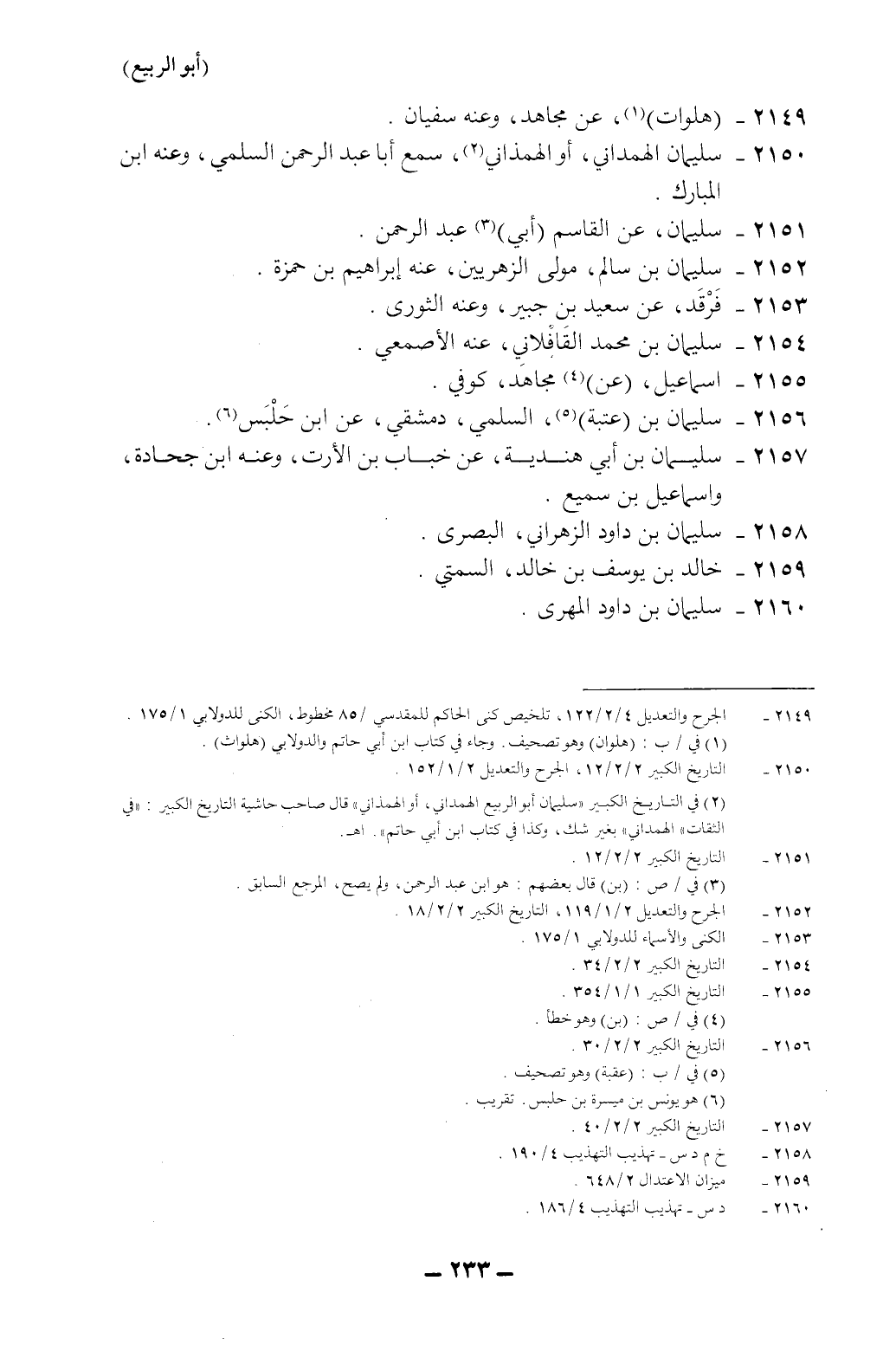 2 في التاريخ الكبير:" سليمان أبو الربيع الهمداني، أو الهمذاني"، قال صاحب حاشية التاريخ الكبير:" في الثقات: الهمداني، بغير شك، وكذا في كتاب ابن أبي حاتم".ا. هـ