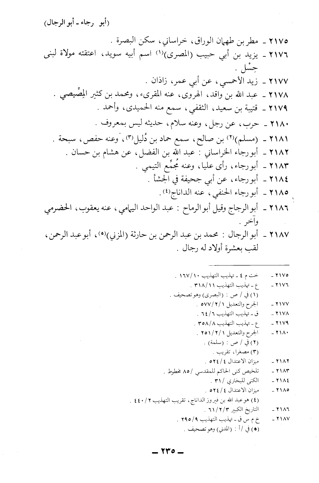 2187- *أبو الرجال: محمد بن عبد الرحمن بن حارثة (المزني) 5، أبو عبد الرحمن، لقب بعشرة أولاد له رجال.