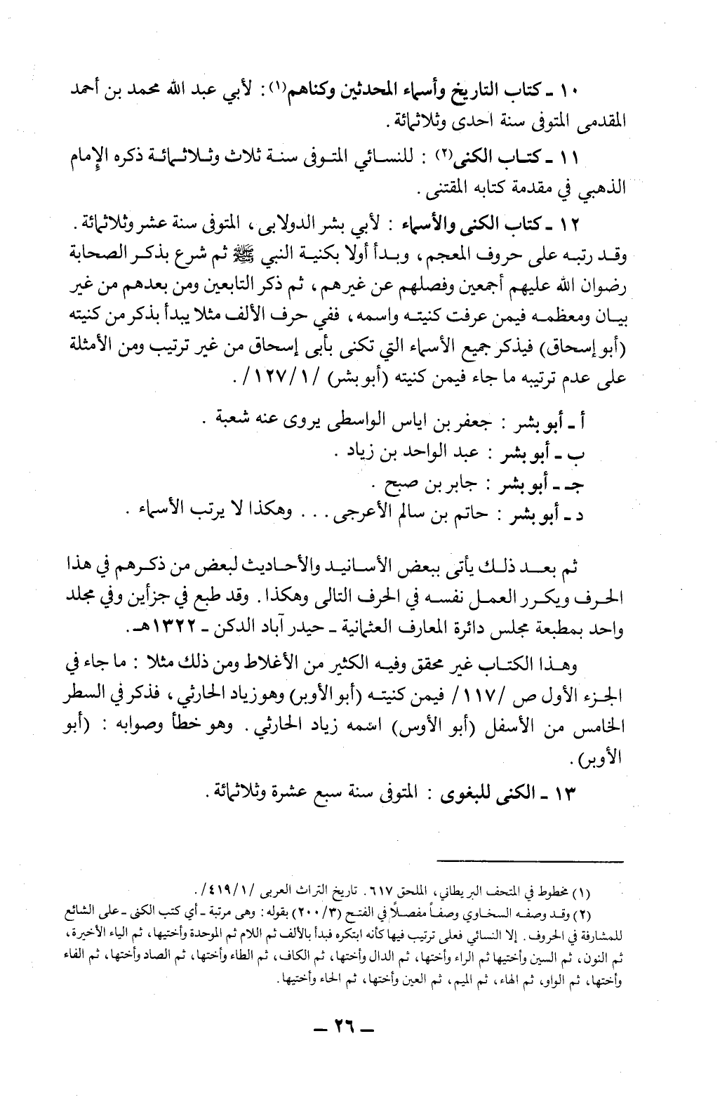 12-كتاب الكنى والأسماء: لأبي بشر الدولابي، المتوفى سنة عشر وثلاثمائة، وقد رتبه على حروف المعجم، وبدأ أولاً بكنية النبي صلى الله عليه وسلم ثم شرع بذكر الصحابة رضوان الله عليهم أجمعين وفصلهم عن غيرهم، ثم ذكر التابعين ومن بعدهم من غير بيان، ومعظمه فيمن عرفت كنيته واسمه، ففي حرف الألف مثلاً يبدأ بذكر من كنيته (أبو إسحاق) فيذكر جميع الأسماء التي تكنى بأبي إسحاق من غير ترتيب، ومن الأمثلة على عدم ترتيبه ما جاء فيمن كنيته أبو بشر 1/127.