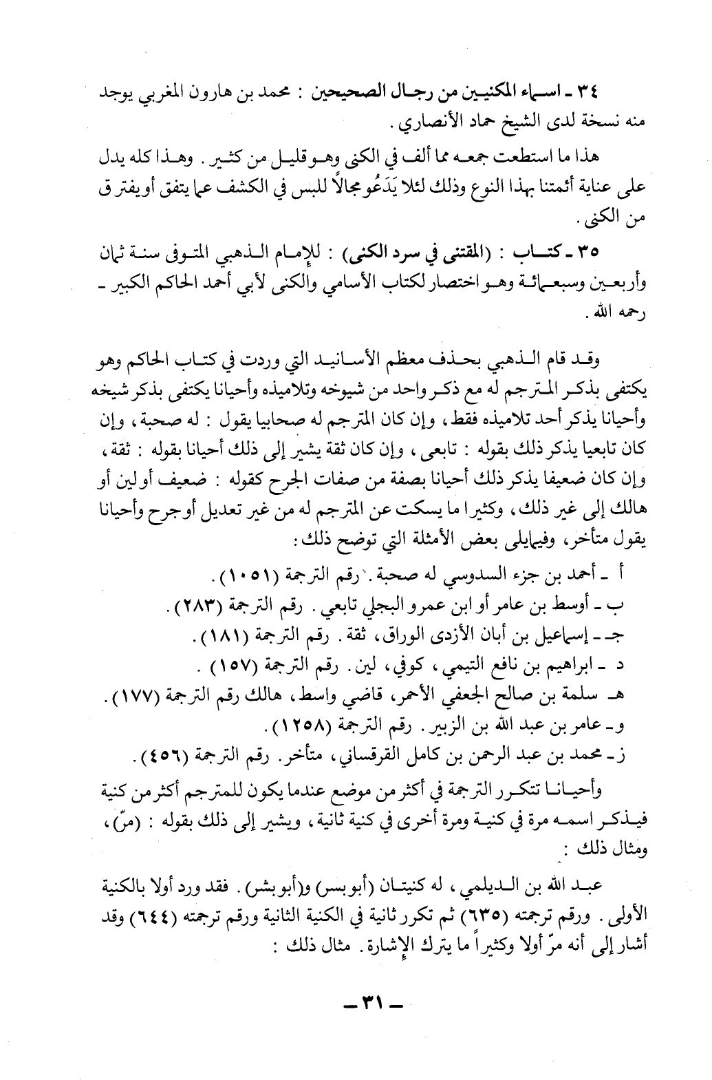34- أسماء المكنيين من رجال الصحيحين: محمد بن هارون المغربي يوجد منه نسخة لدى الشيخ حماد الأنصاري.