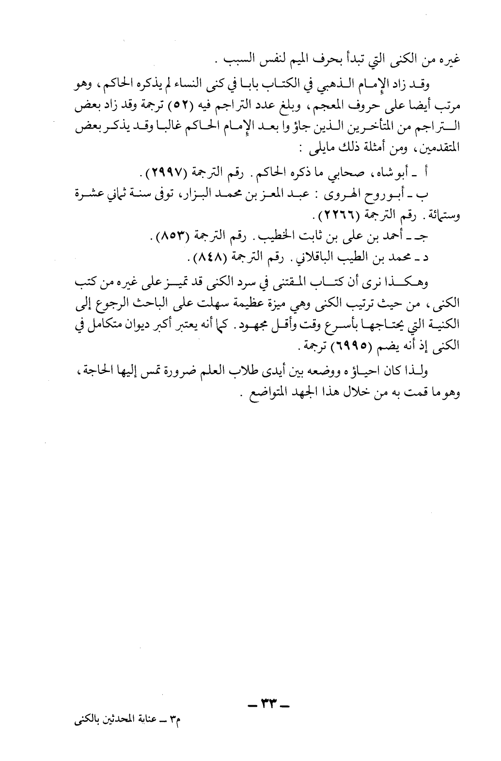 وقد زاد الإمام الذهبي في الكتاب باباً في كنى النساء لم يذكره الحاكم، وهو مرتب أيضاً على حروف المعجم، وبلغ عدد التراجم فيه (52) ترجمة، وقد زاد بعض التراجم من المتأخرين الذين جاؤوا بعد الإمام الحاكم غالباً، وقد يذكر بعض المتقدمين.