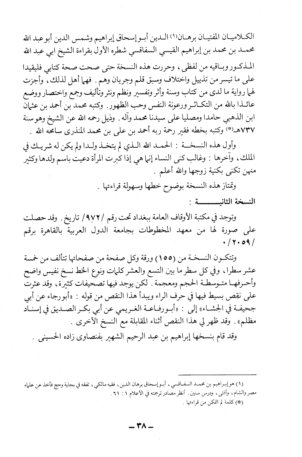 الكلاميان المفتيان برهان (1) الدين أبو إسحاق إبراهيم، وشمس الدين أبو عبد الله محمد بن محمد بن إبراهيم القيسي السفاقسي، شطره الأول بقراءة الشيخ أبي عبد الله المذكور، وباقيه من لفظي، وحررت هذه النسخة حتى صحت صحة كتابي، فليقيدا على ما تيسر من تذييل واختلاف وسبق قلم وجريان وهم، فهما أهل لذلك، وأجزت لهما رواية ما لدي من كتاب وسنة وأثر وتفسير ونظم ونثر، وتأليف وجمع واختصار ووضع، عائذاً بالله من التكاثر ورعونة النفس وحب الظهور، وكتبه محمد بن أحمد بن عثمان ابن الذهبي حامداً ومصلياً على سيدنا محمد وآله.