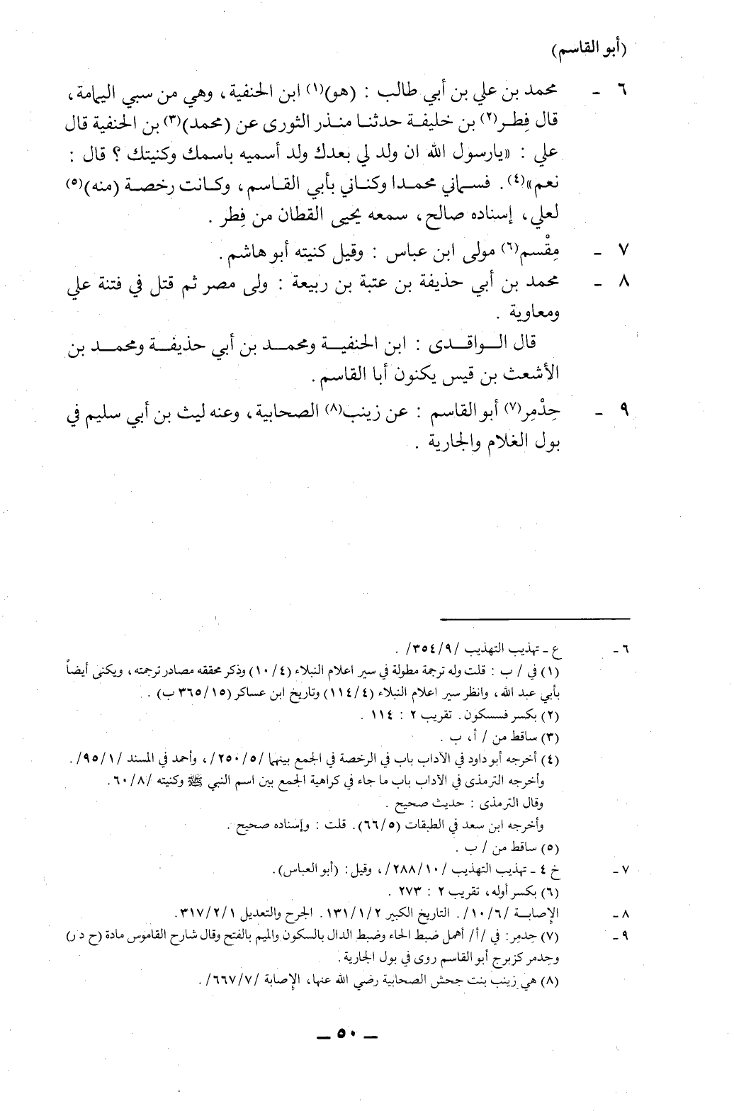 6- محمد بن علي بن أبي طالب: (هو) 1 ابن الحنفية، وهي من سبي اليمامة، قال فِطر2 بن خليفة: حدثنا منذر الثوري عن (محمد) 3 ابن الحنفية، قال علي: "يا رسول الله إن ولد لي بعدك ولد، أسميه باسمك وكنيتك؟ قال: نعم"4. فسماني محمداً، وكناني بأبي القاسم، وكانت رخصة (منه) 5 لعلي، إسناده صالح، سمعه يحيى القطان من فِطر.