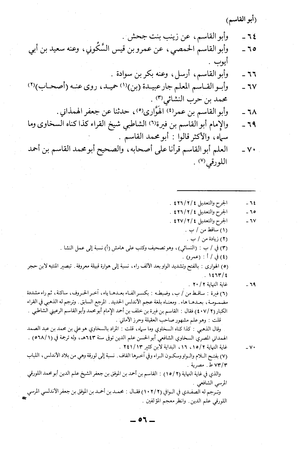 69- والإمام أبو القاسم بن فيرة6 الشاطبي، شيخ القراء كذا كناه السخاوي وما سماه، والأكثر قالوا: أبو محمد القاسم.
