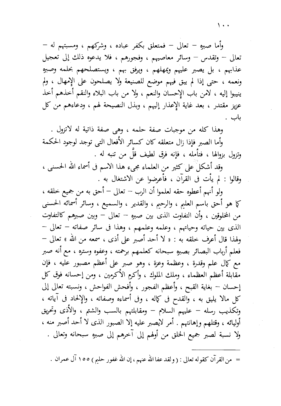 وأما صبره -تعالى- فمتعلق بكفر عباده، وشركهم، ومسبتهم له -تعالى وتقدس- وسائر معاصيهم، وفجورهم، فلا يدعوه ذلك إلى تعجيل عذابهم، بل يصبر عليهم ويمهلهم، ويرفق بهم، ويستصلحهم بحلمه وصبره ونعمه، حتى إذا لم يبق فيهم موضع للصنيعة ولا يصلحون على الإمهال، ولم ينيبوا إليه، لا من باب الإحسان والنعم، ولا من باب البلاء والنقم، أخذهم أخذ عزيز مقتدر، بعد غاية الإعذار إليهم، وبذل النصيحة لهم، ودعائهم من كل باب.