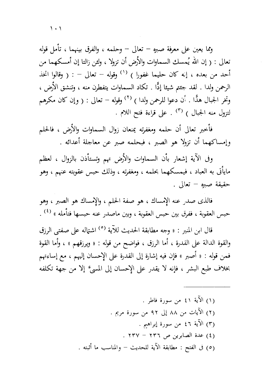 فأخبر -تعالى- أن حلمه ومغفرته يمنعان زوال السماوات والأرض، فالحلم وإمساكهما أن تزولا هو الصبر، فبحلمه صبر عن معاجلة أعدائه.