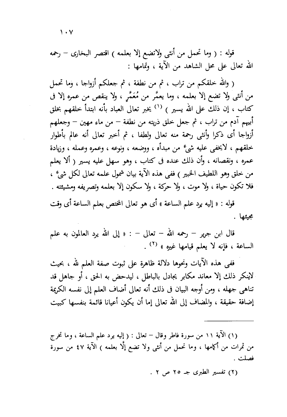 قوله: {وَمَا تَحْمِلُ مِنْ أُنثَى وَلا تَضَعُ إِلاَّ بِعِلْمِهِ} (¬1) اقتصر البخاري-رحمه الله تعالى- على محل الشاهد من الآية والآية بتمامها:
