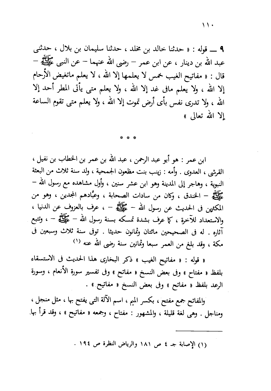 9- قوله: "حدثنا خالد بن مخلد، حدثنا سليمان بن بلال، حدثني عبد الله بن دينار، عن ابن عمر -رضي الله عنهما- عن النبي -صلى الله عليه وسلم - قال: "مفاتيح الغيب خمس لا يعلمها إلا الله، لا يعلم ما تغيض الأرحام إلا الله، ولا يعلم ما في غد إلا الله، ولا يعلم متى يأتي المطر إلا الله، ولا تدري نفس بأي أرض تموت إلا الله، ولا يعلم متى تقوم الساعة إلا الله -تعالى-".