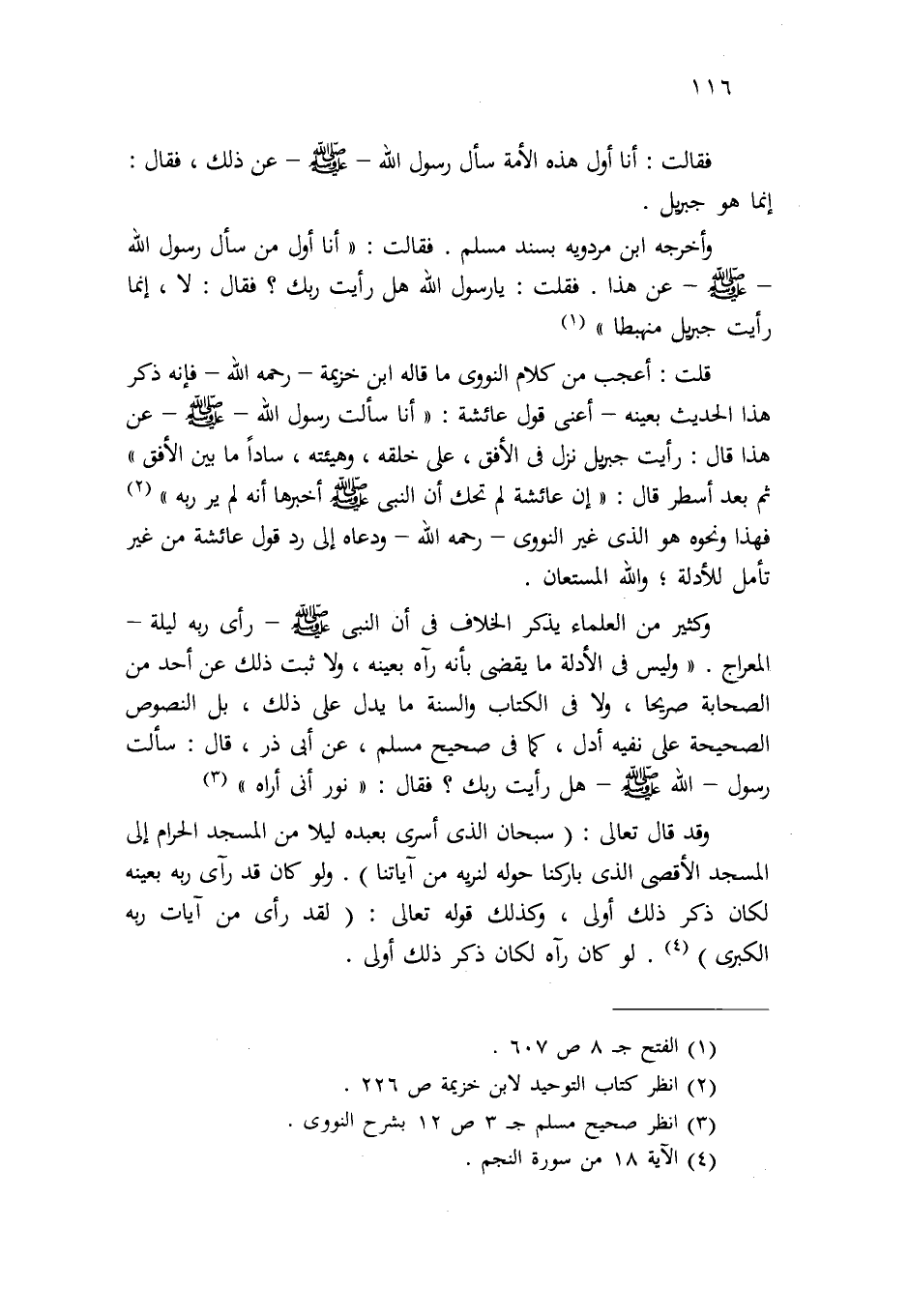 قلت: أعجب من كلام النووي ما قاله ابن خزيمة -رحمه الله- فإنه ذكر هذا الحديث بعينه - أعني قول عائشة-: "أنا سألت رسول الله -صلى الله عليه وسلم - عن هذا، قال: "رأيت جبريل نزل في الأفق، على خلقه، وهيئته، ساداً ما بين الأفق" ثم بعد أسطر قال: "إن عائشة لم تحك أن النبي -صلى الله عليه وسلم - أخبرها أنه لم ير ربه" (¬2) .