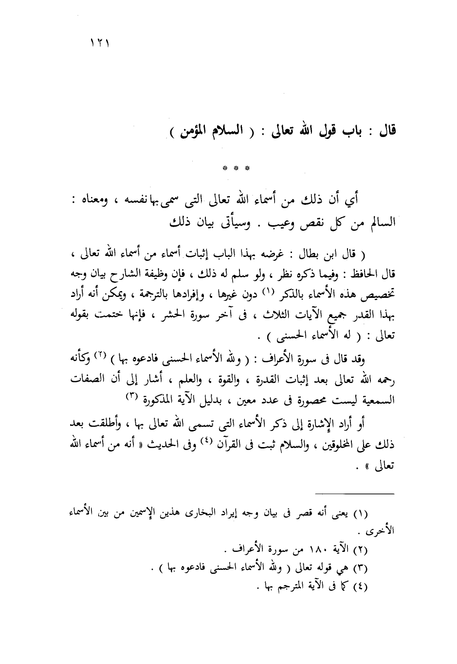 قال: باب قول الله -تعالى-: {السَّلامُ الْمُؤْمِنُ} (¬1) .