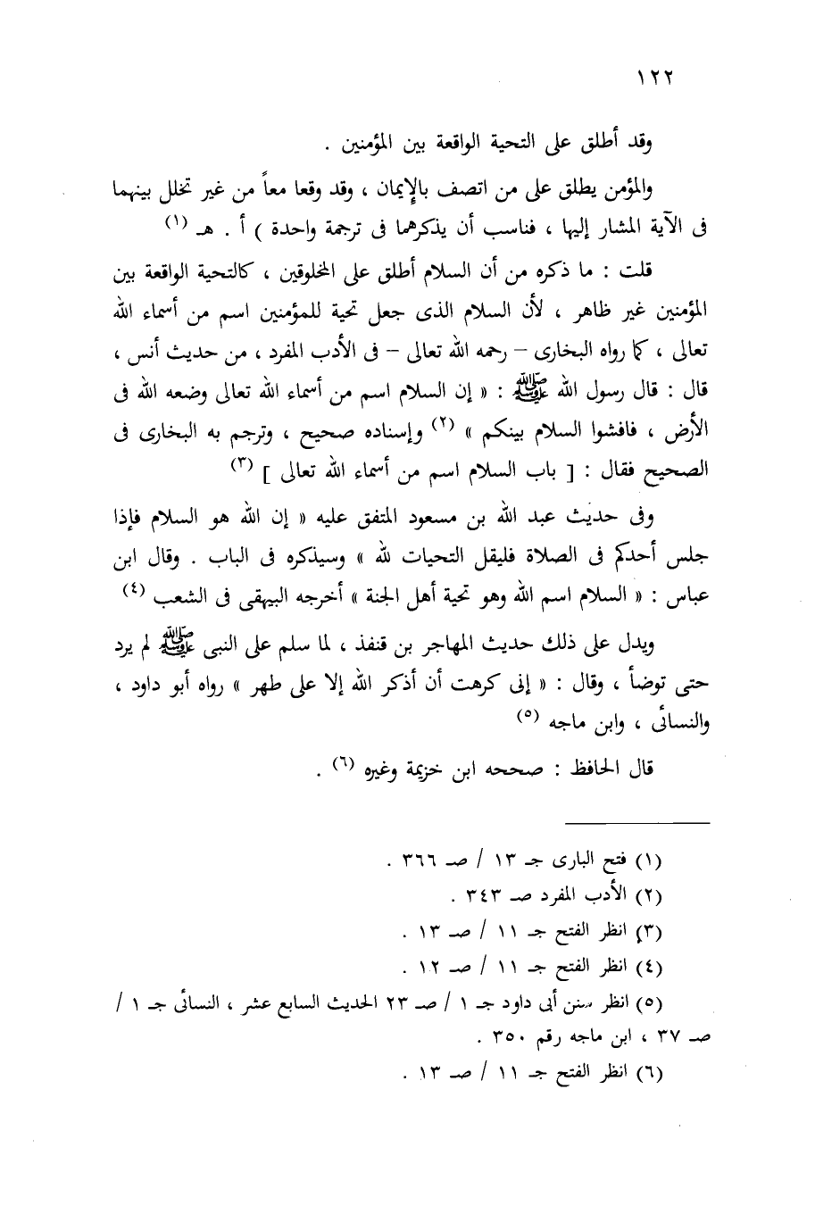 قلت: ما ذكره من أن السلام أطلق على المخلوقين، كالتحية الواقعة بين المؤمنين، غير ظاهر؛ لأن السلام الذي جعل تحية للمؤمنين اسم من أسماء الله –تعالى-، كما رواه البخاري –رحمه الله تعالى- في "الأدب المفرد"، من حديث أنس، قال: قال رسول الله –صلى الله عليه وسلم -: "إن السلام اسم من أسماء الله –تعالى-، وضعه الله