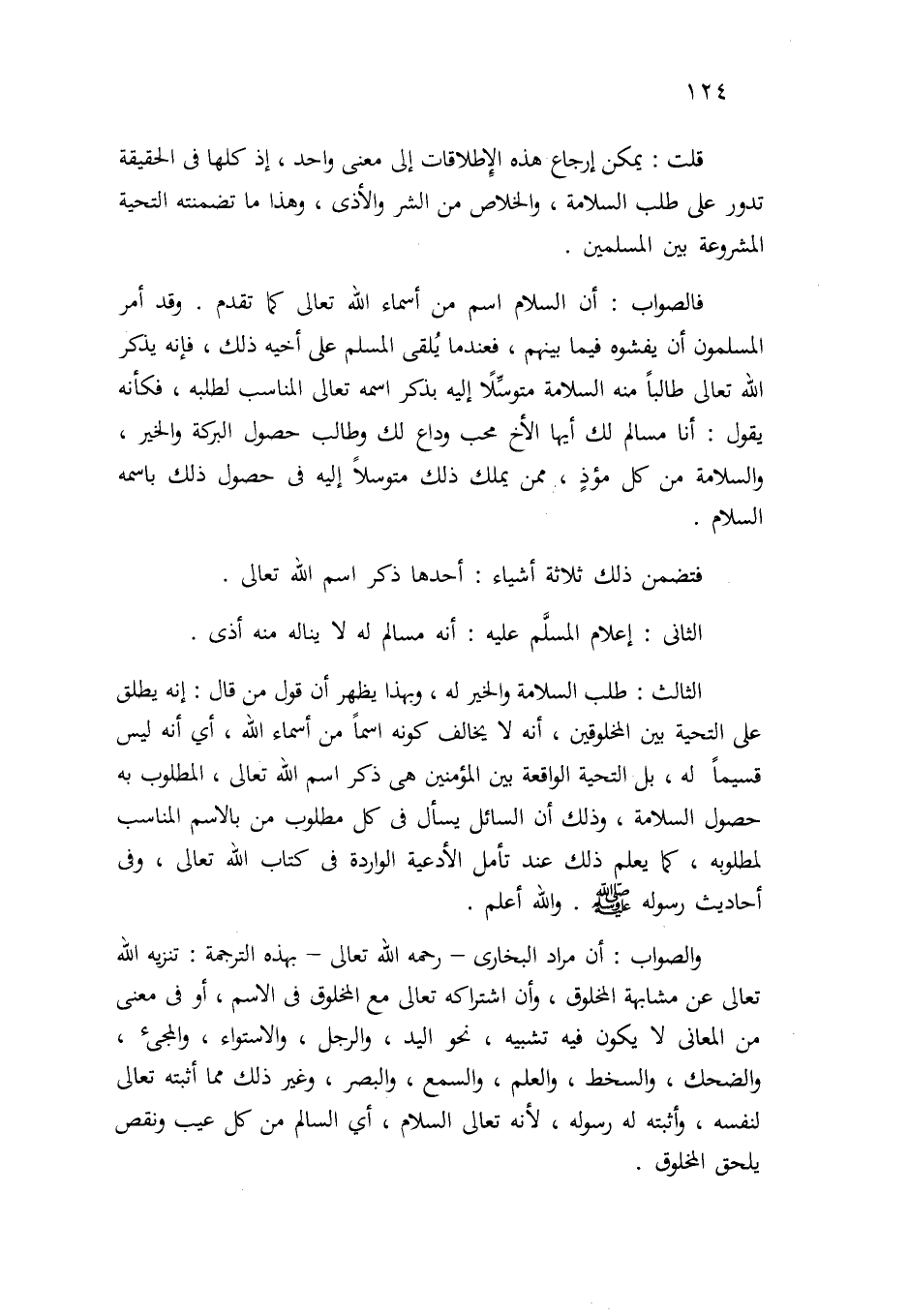 والصواب: أن مراد البخاري- رحمه الله تعالى- بهذه الترجمة: تنزيه الله –تعالى- عن مشابهة المخلوق، وأن اشتراكه – تعالى- مع المخلوق في الاسم، أو في معنى من المعاني، لا يكون فيه تشبيه، نحو اليد، والرجل، والاستواء، والمجيء، والضحك، والسخط، والعلم، والسمع، والبصر، وغير ذلك مما أثبته –تعالى- لنفسه، وأثبته له رسوله: لأنه –تعالى – السلام، أي: السالم من كل عيب ونقص يلحق المخلوق.