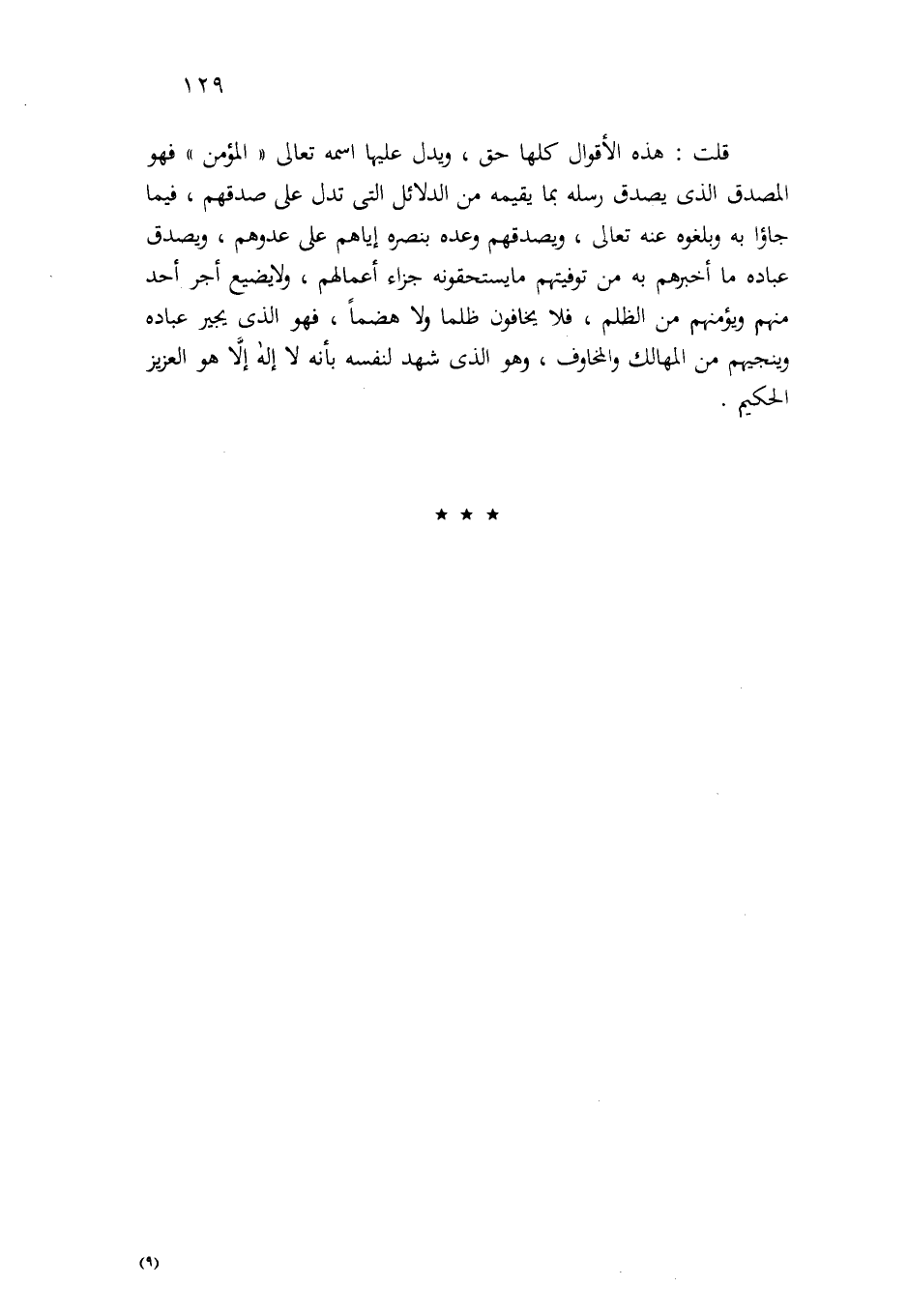 قلت: هذه الأقوال كلها حق، ويدل عليها اسمه –تعالى- "المؤمن" فهو المصدق الذي يصدق رسله بما يقيمه من الدلائل التي تدل على صدقهم فيما جاؤوا به وبلغوه عنه –تعالى-، ويصدقهم وعده بنصره إياهم على عدوهم، وبصدق عباده ما أخبرهم به من توفيتهم ما يستحقونه جزاء أعمالهم، ولا يضيع أجر أحد منهم ويؤمنهم من الظلم، فلا يخافون ظلماً ولا هضماً، فهو الذي يجير عباده وينجيهم من المهالك والمخاوف، وهو الذي شهد لنفسه بأنه لا إله إلا هو العزيز الحكيم.