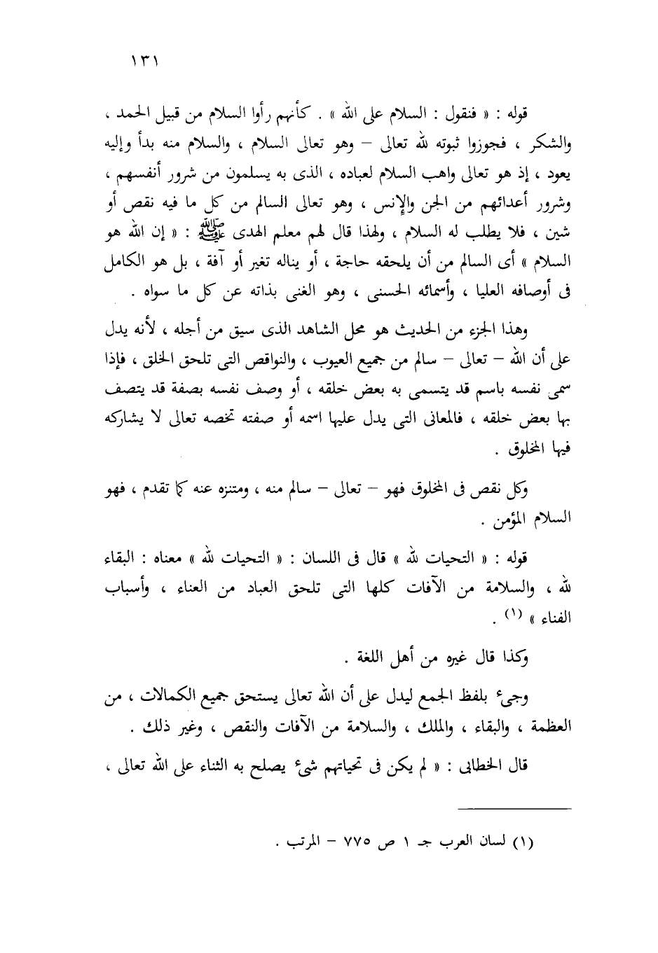 قوله: "فنقول: السلام على الله"، كأنهم رأوا السلام من قبيل الحمد، والشكر، فجوزوا ثبوته لله - تعالى -، وهو تعالى السلام، والسلام منه بدأ وإليه يعود، إذ هو -تعالى- واهب السلام لعباده، الذي به يسلمون من شرور أنفسهم، وشرور أعدائهم من الجن والإنس، وهو -تعالى- السالم من كل ما فيه نقص أو شين، فلا يطلب له السلام، ولهذا قال معلم الهدى- صلى الله عليه وسلم-: " إن الله هو السلام" أي السالم من أن يلحقه حاجة، أو يناله تغير أو آفة، بل هو الكامل في أوصافه العليا، وأسمائه الحسنى، وهو الغني بذاته عن كل ما سواه.