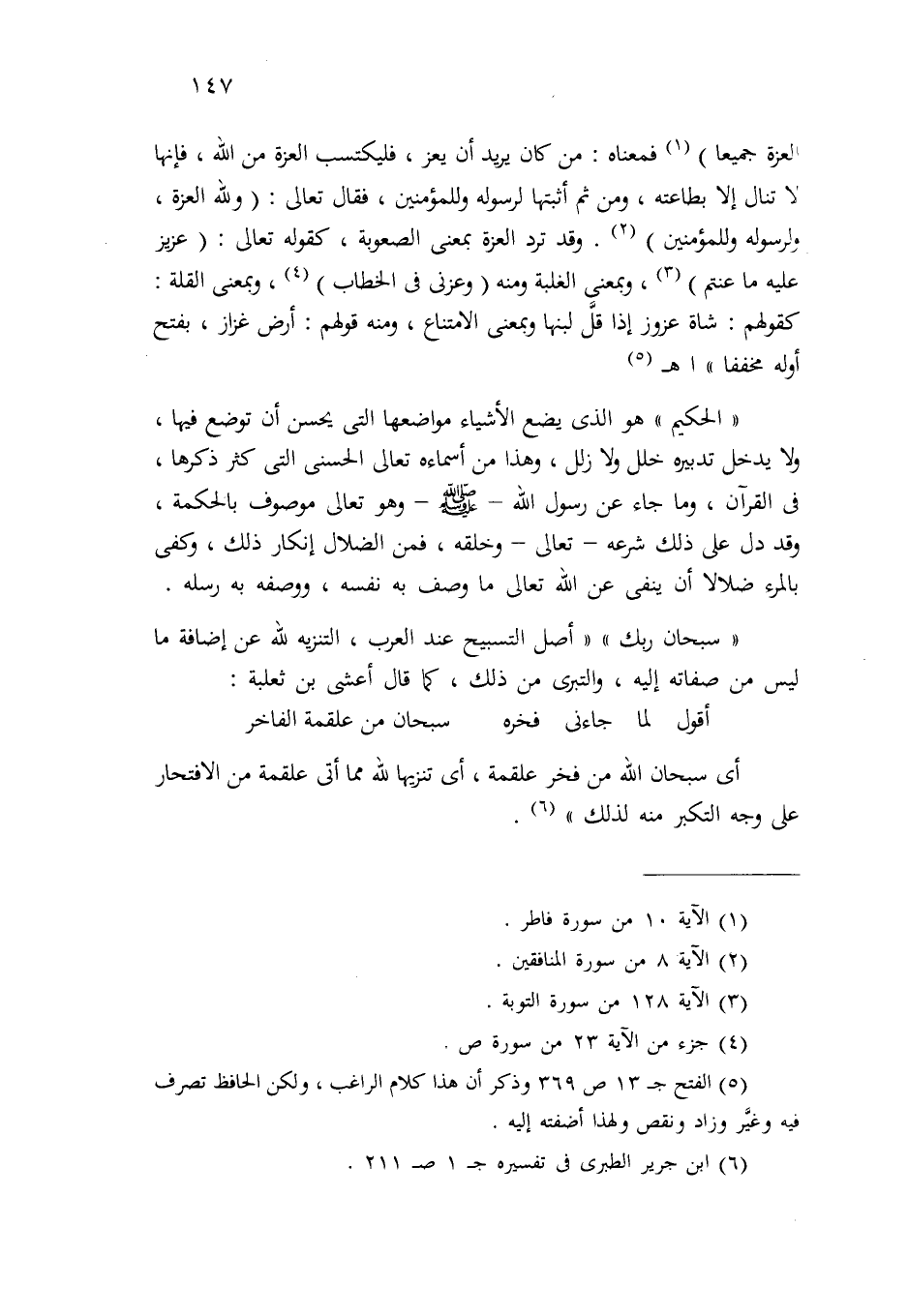 (¬5) "الفتح" (13/369) وذكر أن هذا كلام الراغب، ولكن الحافظ تصرف فيه وغير وزاد ونقص، ولهذا أضفته إليه.