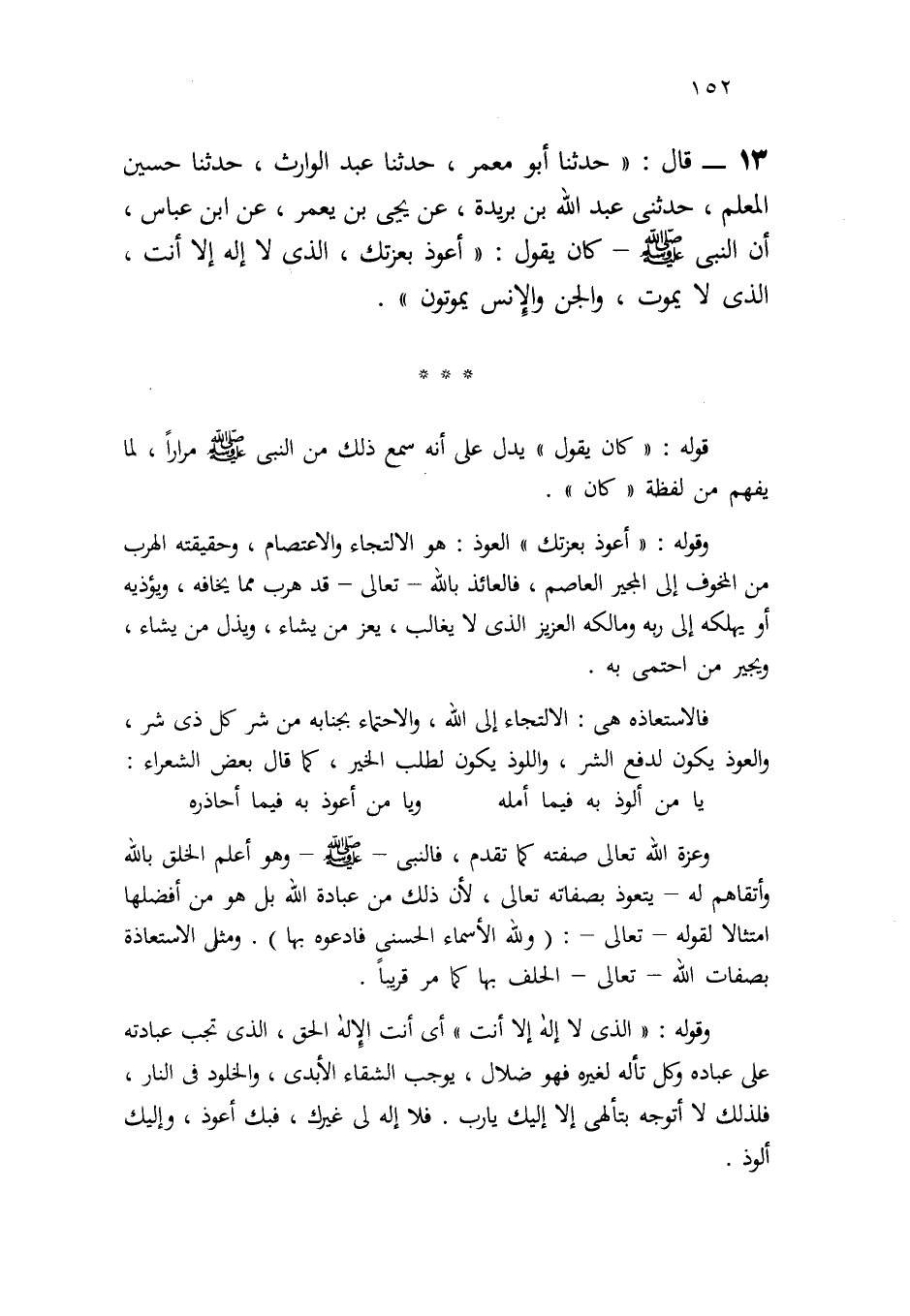 13- قال: "حدثنا أبو معمر، حدثنا عبد الوارث، حدثنا حسين المعلم، حدثني عبد الله بن بريدة، عن يحيي بن يعمر، عن ابن عباس، أن النبي -صلى الله عليه وسلم - كان يقول: " أعوذ بعزتك، الذي لا إله إلا أنت، الذي لا يموت، والجن والإنس يموتون".