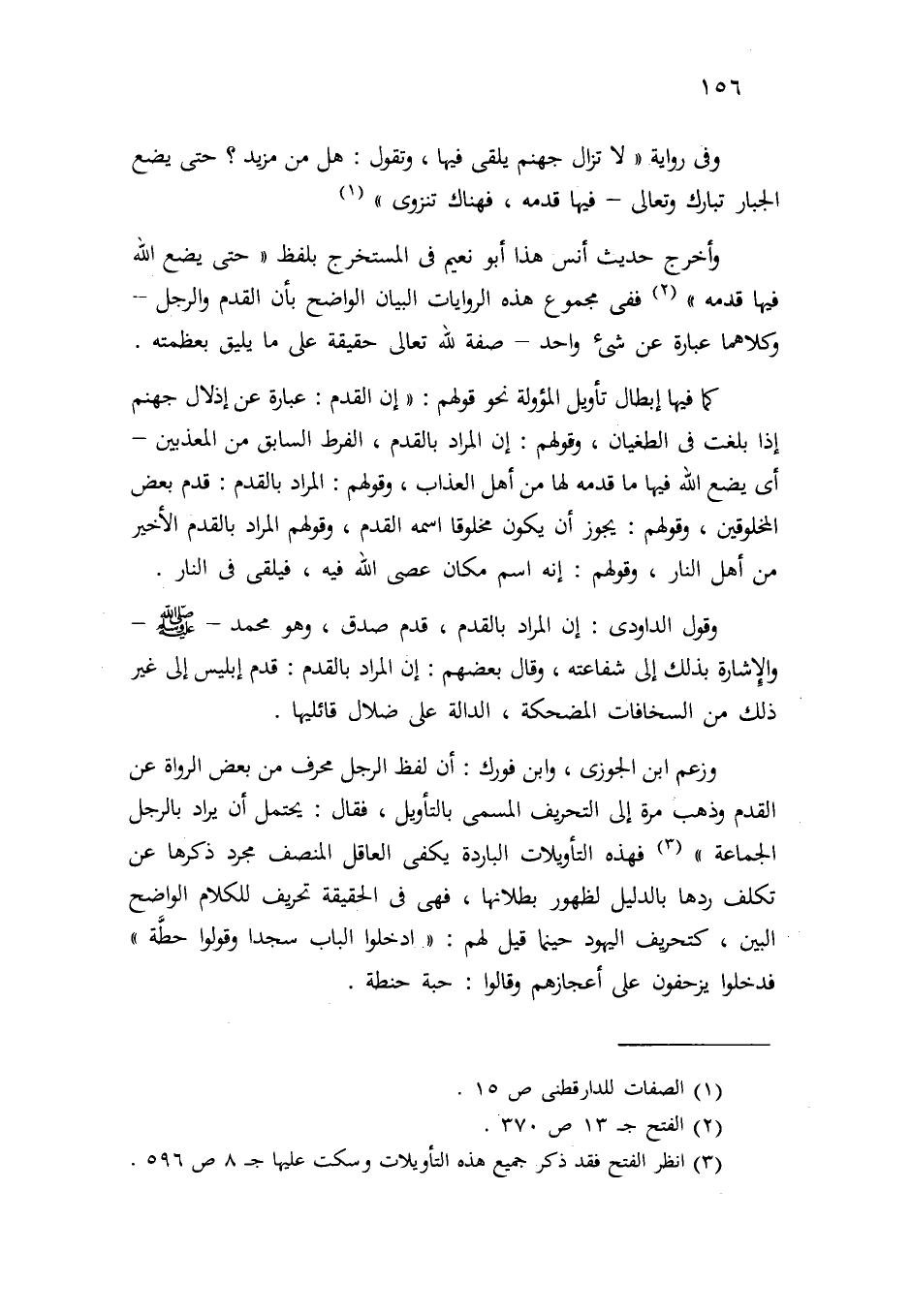 وزعم ابن الجوزي، وابن فورك: أن لفظ الرجل محرف من بعض الرواة عن القدم، وذهب مرة إلى تحريف المسمى بالتأويل، فقال: يحتمل أن يراد بالرجل: الجماعة" (¬3) ، فهذه التأويلات الباردة يكفي العاقل المنصف مجرد ذكرها عن تكلف ردها بالدليل لظهور بطلانها، فهي في الحقيقة تحريف للكلام الواضح البين، كتحريف اليهود حينما قيل لهم: "ادخلوا الباب سجدا وقولوا حطة" فدخلوا يزحفون على أعجازهم وقالوا: حبة حنطة.