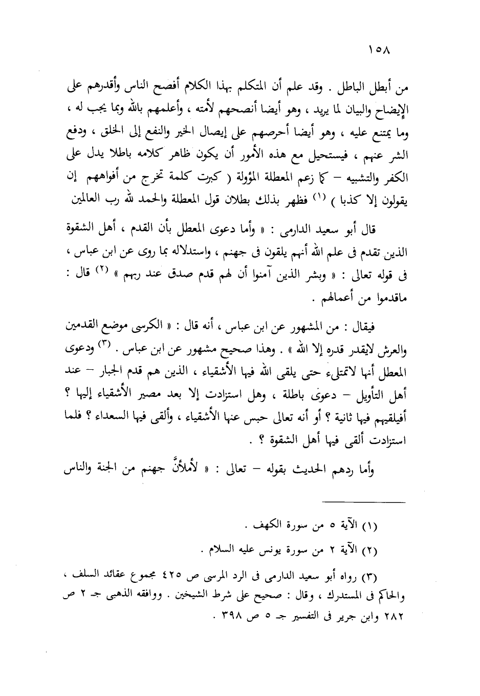 قال أبو سعيد الدارمي: "وما دعوى المعطل بأن القدم: أهل الشقوة الذين تقدم في علم الله أنهم يلقون في جهنم، واستدلاله بما روي عن ابن عباس، في قوله-تعالى-: {وَبَشِّرِ الَّذِينَ آمَنُواْ أَنَّ لَهُمْ قَدَمَ صِدْقٍ عِندَ رَبِّهِمْ} (¬2) قال: ما قدموا من أعمالهم.