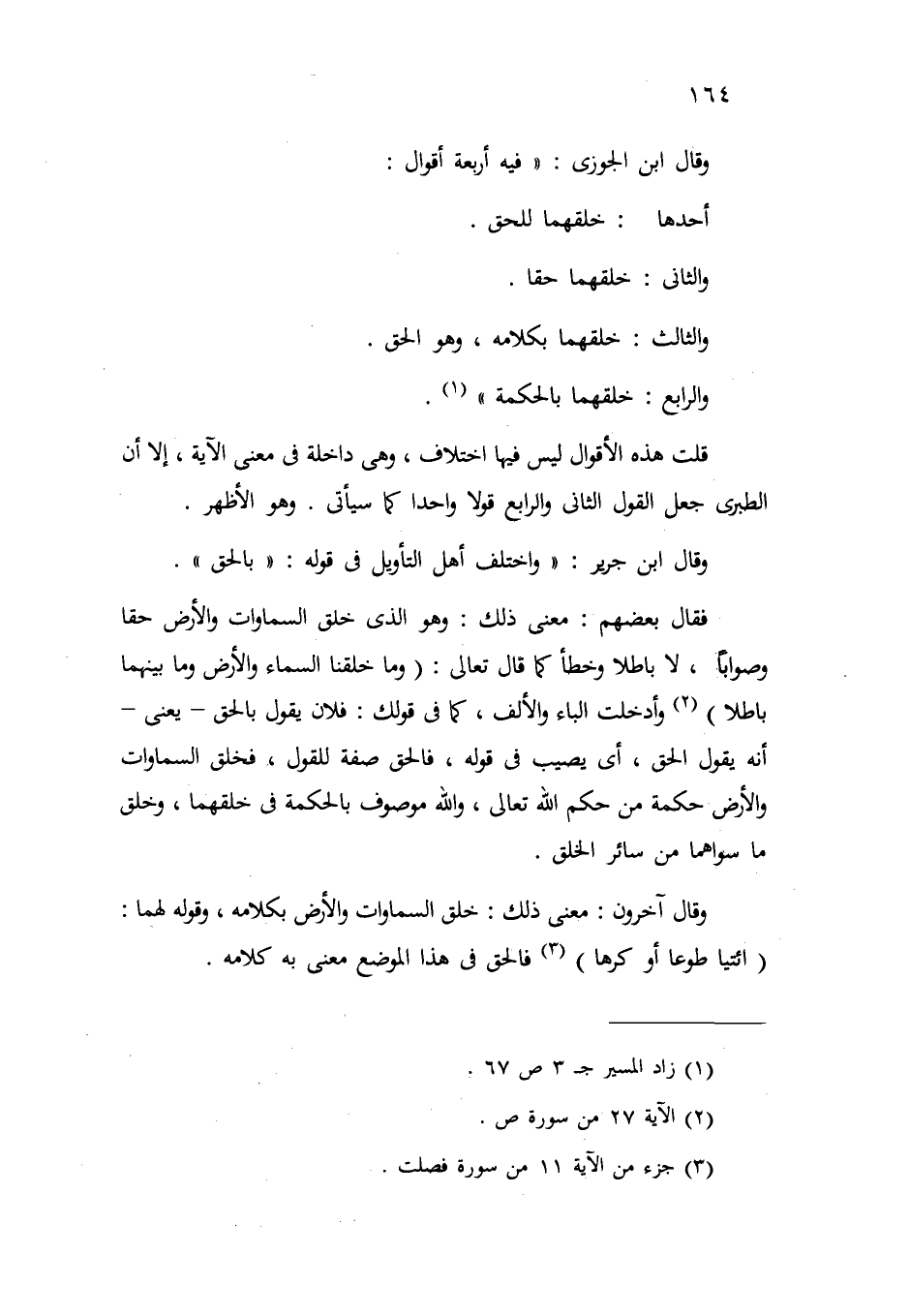 وقال ابن جرير: " واختلف أهل التأويل في قوله: " بالحق": فقال بعضهم: معنى ذلك: وهو الذي خلق السماوات والأرض حقاً وصواباً، لا باطلاً وخطأ، كما قال تعالى: {وَمَا خَلَقْنَا السَّمَاء وَالأَرْضَ وَمَا بَيْنَهُمَا بَاطِلاً} (¬2) ، وأدخلت الباء والألف، كما في