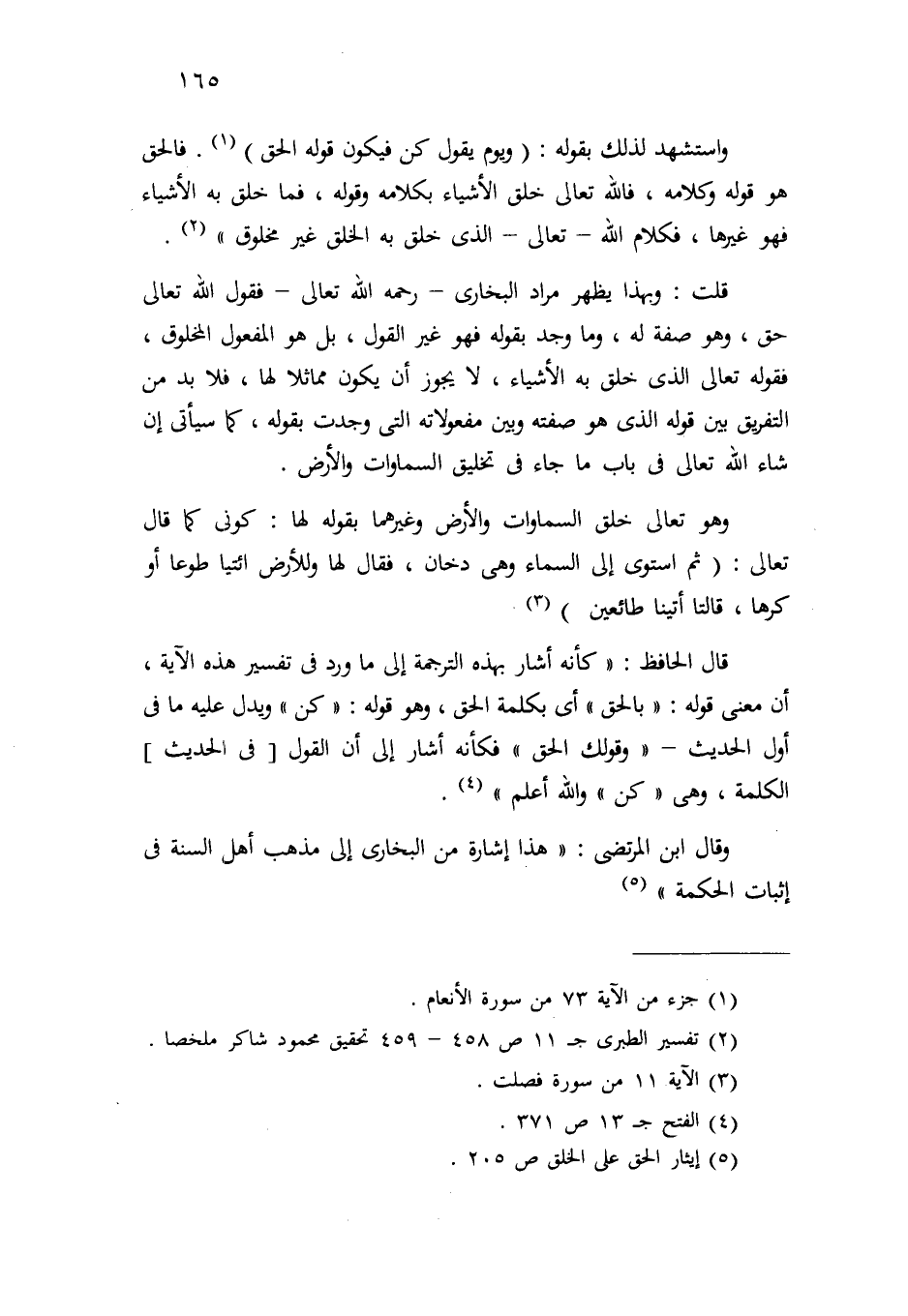 واستشهد لذلك بقوله: {وَيَوْمَ يَقُولُ كُن فَيَكُونُ قَوْلُهُ الْحَقُّ} (¬1) ، فالحق هو قوله وكلامه، فالله -تعالى- خلق الأشياء بكلامه وقوله، فما خلق به الأشياء فهو غيرها، فكلام الله -تعالى- الذي خلق الخلق غير مخلوق" (¬2) .