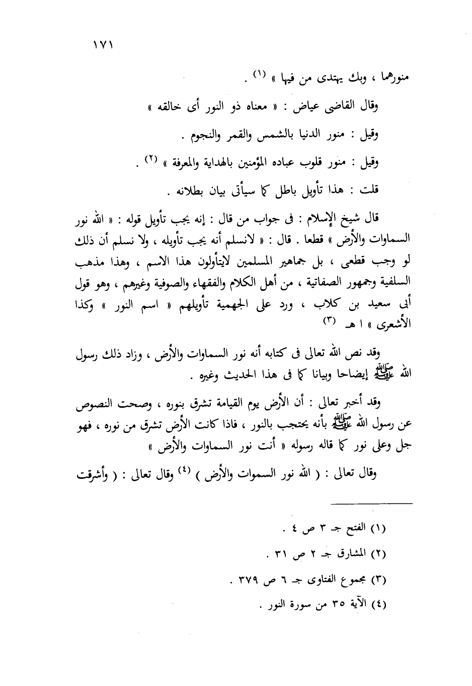 قال شيخ الإسلام في جواب من قال: إنه يجب تأويل قوله: " الله نور السماوات والأرض " قطعاً. قال: " لا نسلم أنه يجب تأويله، ولا نسلم أن ذلك لو وجب قطعي، بل جماهير المسلمين لا يتأولون هذا الاسم، وهذا مذهب السلفية وجمهور الصفاتية من أهل الكلام والفقهاء والصوفية وغيرهم، وهو قول أبي سعيد ابن كلاب، ورد على الجهمية تأويلهم " اسم النور" وكذا الأشعري" ا. هـ (¬3) .