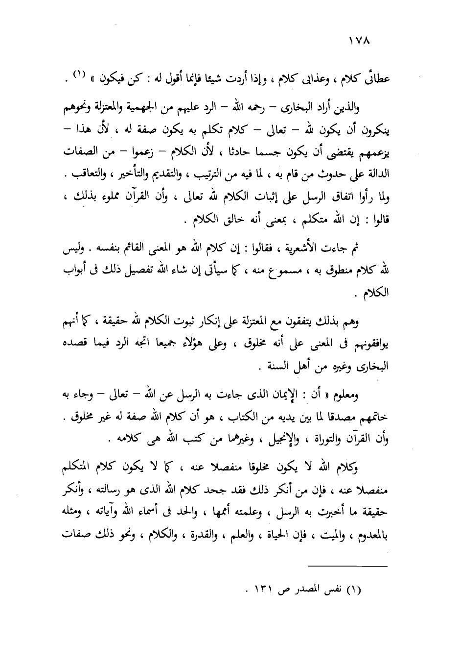 وكلام الله لا يكون مخلوقاً منفصلاً عنه، كما لا يكون كلام المتكلم منفصلاً عنه، فإن من أنكر ذلك فقد جحد كلام الله الذي هو رسالته، وأنكر حقيقة ما أخبرت به الرسل، وعلمته أممها، وألحد في أسماء الله وآياته، ومثله بالمعدوم، والميت، فإن الحياة، والعلم، والقدرة، والكلام، ونحو ذلك، صفات