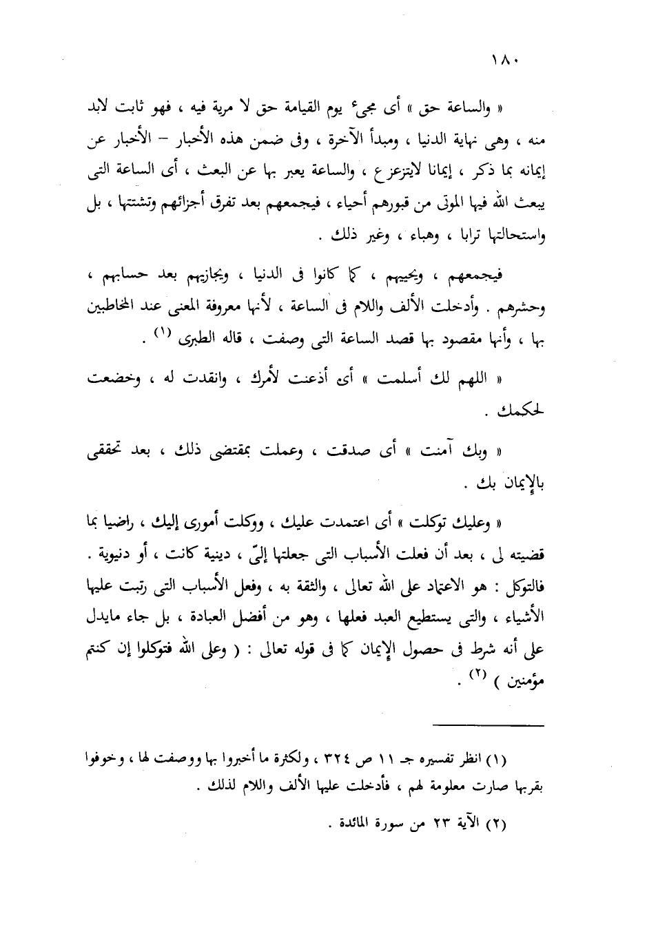 "والساعة حق" أي مجيء يوم القيامة حق لا مرية فيه، فهو ثابت لا بد منه، وهي نهاية الدنيا، ومبدأ الآخرة، وفي ضمن هذه الأخبار: الإخبار عن إيمانه بما ذكر، إيماناً لا يتزعزع، والساعة يعبر بها عن البعث، أي الساعة التي يبعث الله فيها الموتى من قبورهم أحياء، فيجمعهم بعد تفرق أجزائهم وتشتتها، بل واستحالتها تراباً، وهباء، وغير ذلك.