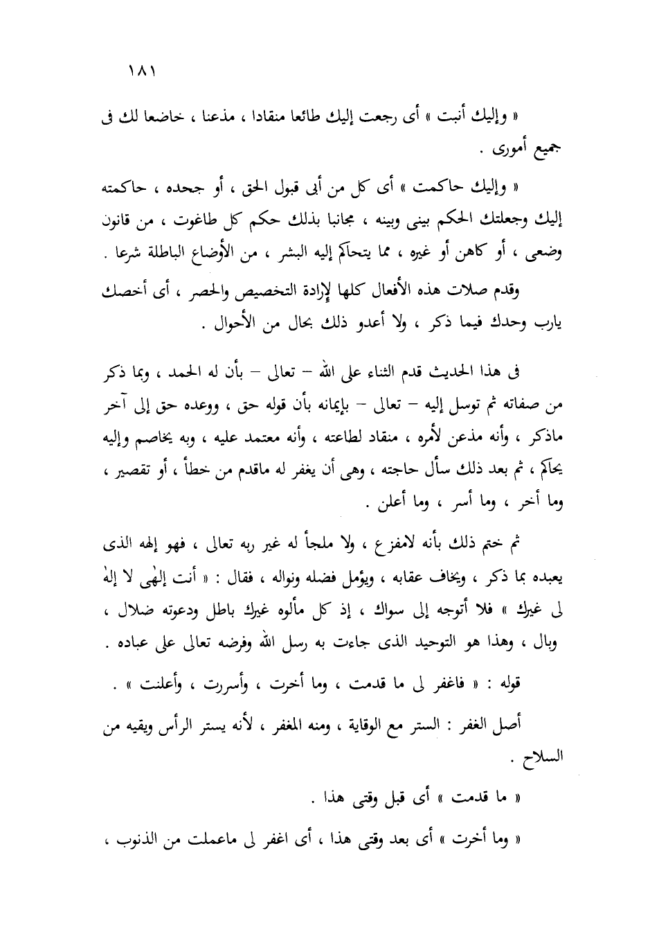 في هذا الحديث قدم الثناء على الله -تعالى- بأن له الحمد، وبما ذكر من صفاته، ثم توس إليه، -تعالى- بإيمانه بأن قوله حق، ووعده حق، إلى آخر ما ذكر، وأنه مذعن لأمره، منقاد لطاعته، وأنه معتمد عليه، وبه يخاصم وإليه يحاكم، ثم بعد ذلك سأل حاجته، وهي أن يغفر له ما قدم من خطأ، أو تقصير، وما أخر، وما أسر، وما أعلن.