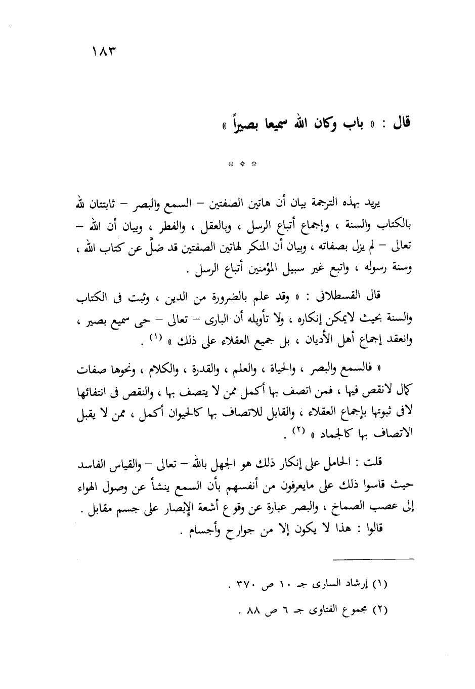 قال القسطلاني: " وقد علم بالضرورة من الدين، وثبت في الكتاب والسنة، بحيث لا يمكن إنكاره ولا تأويله، أن الباري -تعالى- حي سميع بصير، وانعقد إجماع أهل الأديان – بل جميع العقلاء- على ذلك" (¬3) .
