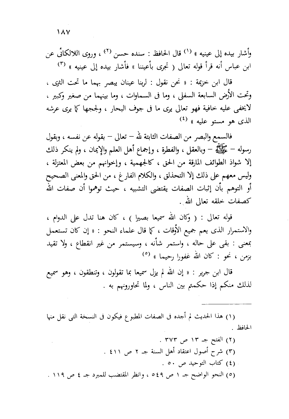 وأشار بيده إلى عينيه" (¬1) قال الحافظ: سنده حسن (¬2) ، وروى اللالكائي عن ابن عباس أنه قرأ قوله –تعالى-: {تَجْرِي بِأَعْيُنِنَا} فأشار بيده إلى عينيه (¬3) .