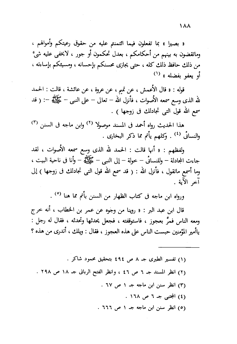 ولفظهم: " أنها قالت: الحمد لله الذي وسع سمعه الأصوات، لقد جاءت المجادلة – وللنسائي- خولة – إلى النبي –صلى الله عليه وسلم- وأنا في ناحية البيت، وما أسمع ما تقول، فأنزل الله: {قَدْ سَمِعَ اللَّهُ قَوْلَ الَّتِي تُجَادِلُكَ فِي زَوْجِهَا} إلى آخر الآية.