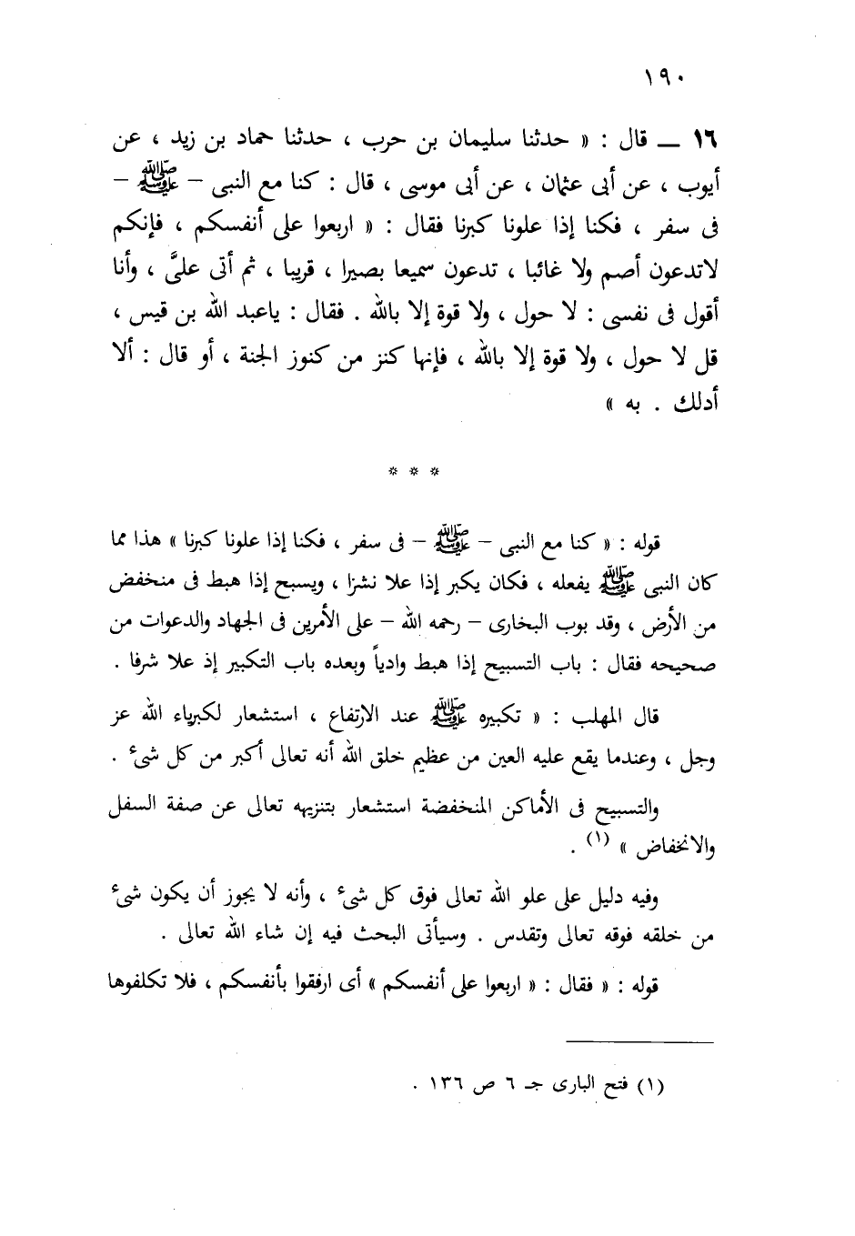 16-قال: " حدثنا سليمان بن حرب، حدثنا حماد بن زيد، عن أيوب، عن أبي عثمان، عن أبي موسى، قال: كنا مع النبي -صلى الله عليه وسلم- في سفر، فكنا إذا علونا كبرنا، فقال: " اربعوا على أنفسكم، فإنكم لا تدعون أصم ولا غائباً، تدعون سميعاً بصيراً قريباً" ثم أتى علىّ، وأنا أقول في نفسي: لا حول ولا قوة إلا بالله، فقال: " يا عبد الله ابن قيس، قل: لا حول ولا قوة إلا بالله، فإنها كنز من كنوز الجنة" أو قال: " ألا أدلك به".