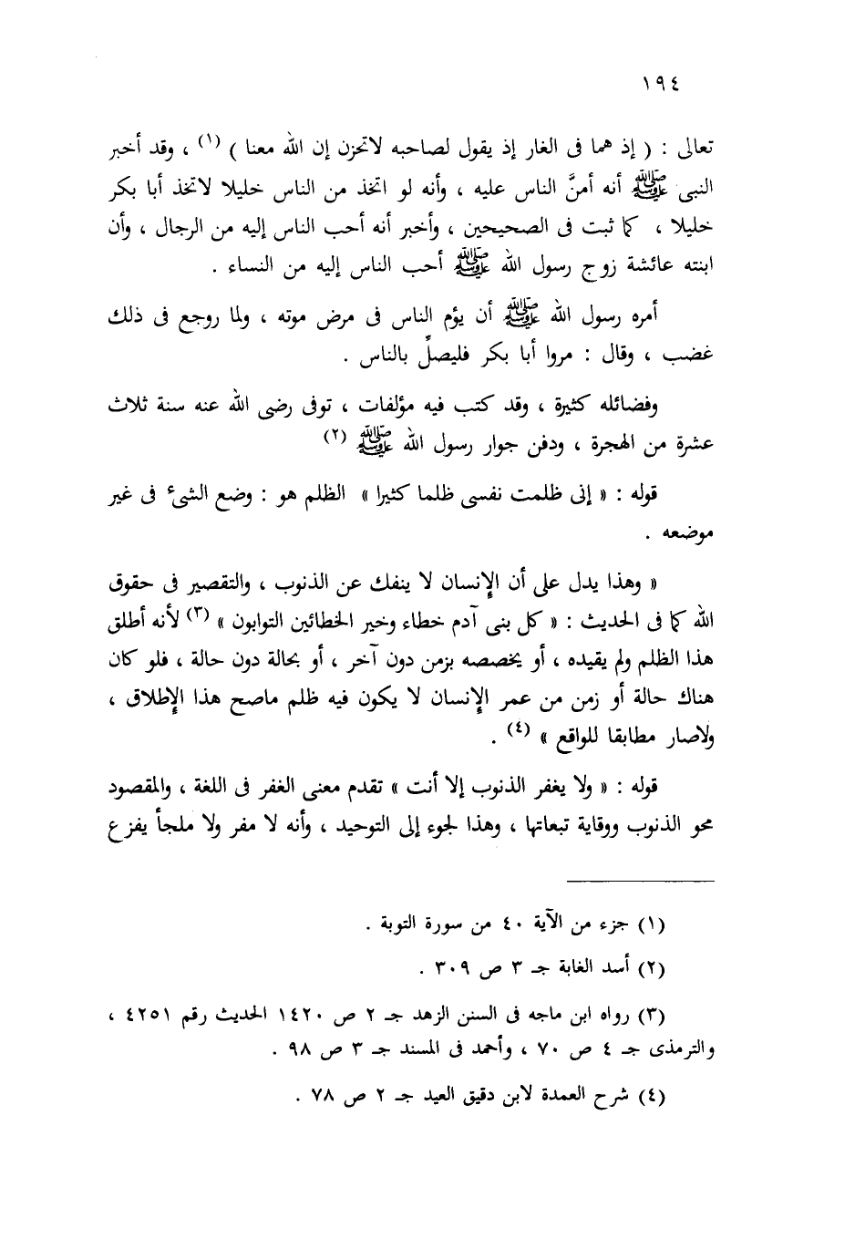 -تعالى-: {إِذْ هُمَا فِي الْغَارِ إِذْ يَقُولُ لِصَاحِبِهِ لاَ تَحْزَنْ إِنَّ اللهَ مَعَنَا} (¬1) ، وقد أخبر النبي -صلى الله عليه وسلم- أنه أمن الناس عليه، وأنه لو اتخذ من الناس خليلاً لاتخذ أبا بكر خليلاً، كما ثبت في "الصحيحين"، وأخبر أنه أحب الناس إليه من الرجال، وأن ابنته عائشة زوج رسول الله -صلى الله عليه وسلم- أحب الناس إليه من النساء.