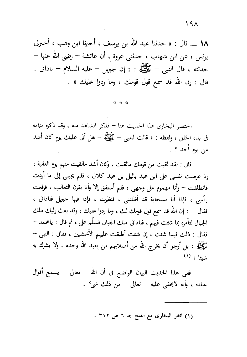 18- قال: " حدثنا عبد الله بن يوسف، أخبرنا ابن وهب، أخبرني يونس، عن ابن شهاب، حدثني عروة - أن عائشة - رضي الله عنها - حدثته، قال النبي -صلى الله عليه وسلم-: إن جبريل - عليه السلام - ناداني، قال: " إن الله قد سمع قول قومك، وما ردوا عليك".