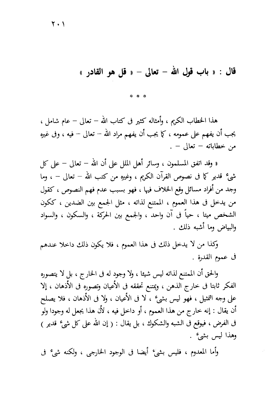 "وقد اتفق المسلمون وسائر أهل الملل على أن الله -تعالى- على كل شيء قدير، كما في نصوص القرآن الكريم، وغيره من كتب الله -تعالى- وما وجد من أفراد مسائل وقع الخلاف فيها، فهو بسبب عدم فهم النصوص، كقول من يدخل في هذا العموم، الممتنع لذاته، مثل الجمع بين الضدين، ككون الشخص ميتاً حياً في آن واحد، والجمع بين الحركة والسكون، والسواد والبياض، وما أشبه ذلك.