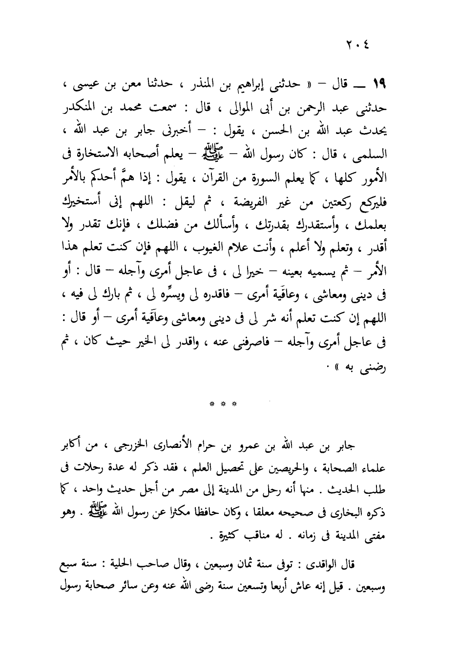 19- قال: " حدثني إبراهيم بن المنذر، حدثنا معن بن عيسى، حدثني عبد الرحمن ابن أبي الموالي، قال: سمعت محمد بن المنكدر يحدث عبد الله بن الحسن، يقول: أخبرني جابر بن عبد الله، السلمي، قال: كان رسول الله -صلى الله عليه وسلم- يعلم أصحابه الاستخارة في الأمور كلها، كما يعلمهم السورة من القرآن، يقول: إذا هم أحدكم بالأمر فليركع ركعتين من غير الفريضة، ثم ليقل: اللهم إني أستخيرك بعلمك، وأستقدرك بقدرتك، وأسألك من فضلك، فإنك تقدر ولا أقدر، وتعلم ولا أعلم، وأنت علام الغيوب، اللهم فإن كنت تعلم هذا الأمر - ثم تسميه بعينه - خيراً لي، في عاجل أمري وآجله - قال: أو: في ديني ومعاشي، وعاقبة أمري- فاقدره لي ويسره لي، ثم بارك لي فيه، اللهم إن كنت تعلم أنه شر لي في ديني ومعاشي وعاقبة أمري - أو قال: في عاجل أمري وآجله - فاصرفني عنه، واقدر لي الخير حيث كان، ثم رضني به".