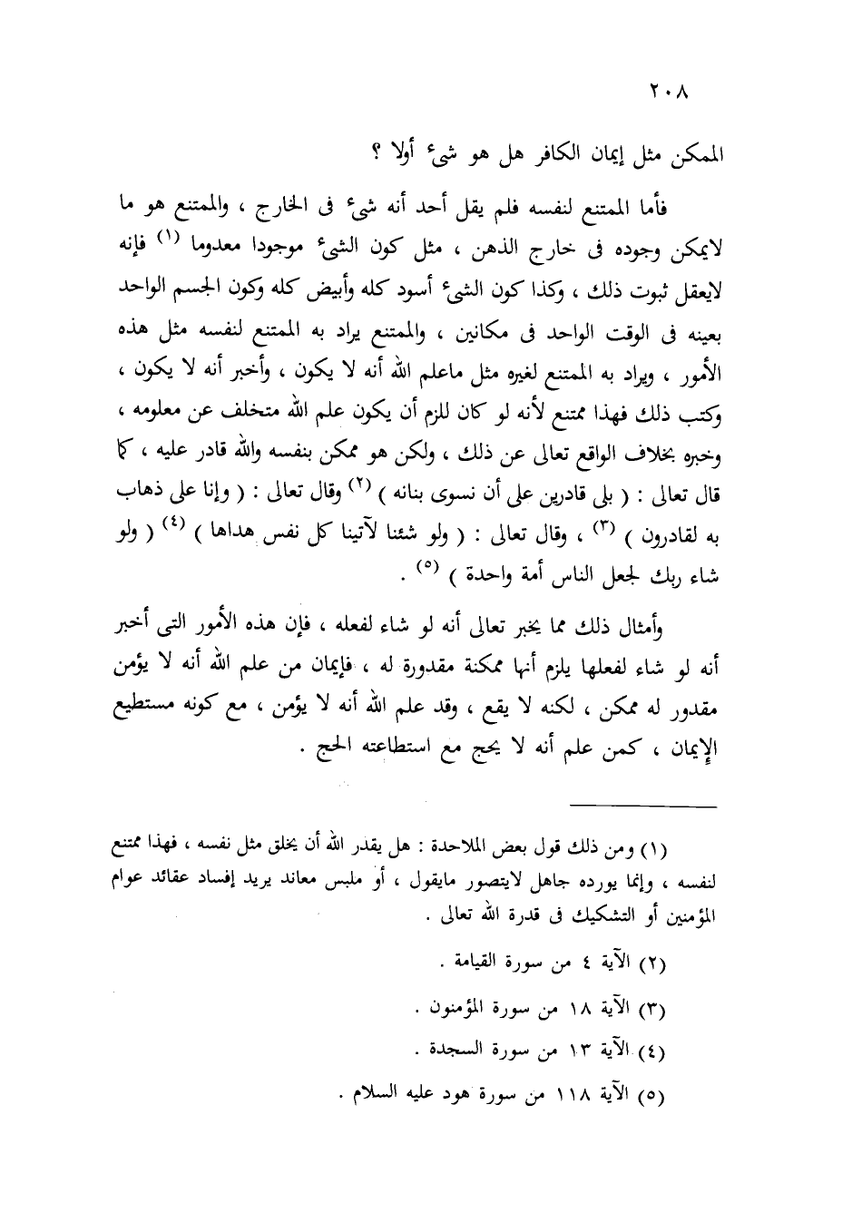 وأمثال ذلك مما يخبر -تعالى- أنه لو شاء لفعله، فإن هذه الأمور التي أخبر أنه لو شاء لفعلها يلزم أنها ممكنة مقدورة له، فإيمان من علم الله أنه لا يؤمن مقدور له ممكن، لكنه لا يقع، وقد علم الله أنه لا يؤمن، مع كونه مستطيع الإيمان، كمن علم أنه لا يحج مع استطاعته الحج.