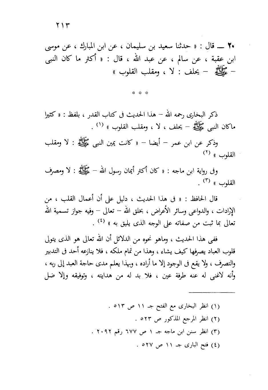 ذكر البخاري - رحمه الله - هذا الحديث في كتاب القدر، بلفظ: " كثيراً ما كان النبي-صلى الله عليه وسلم- يحلف" لا، ومقلب القلوب" (¬1) .